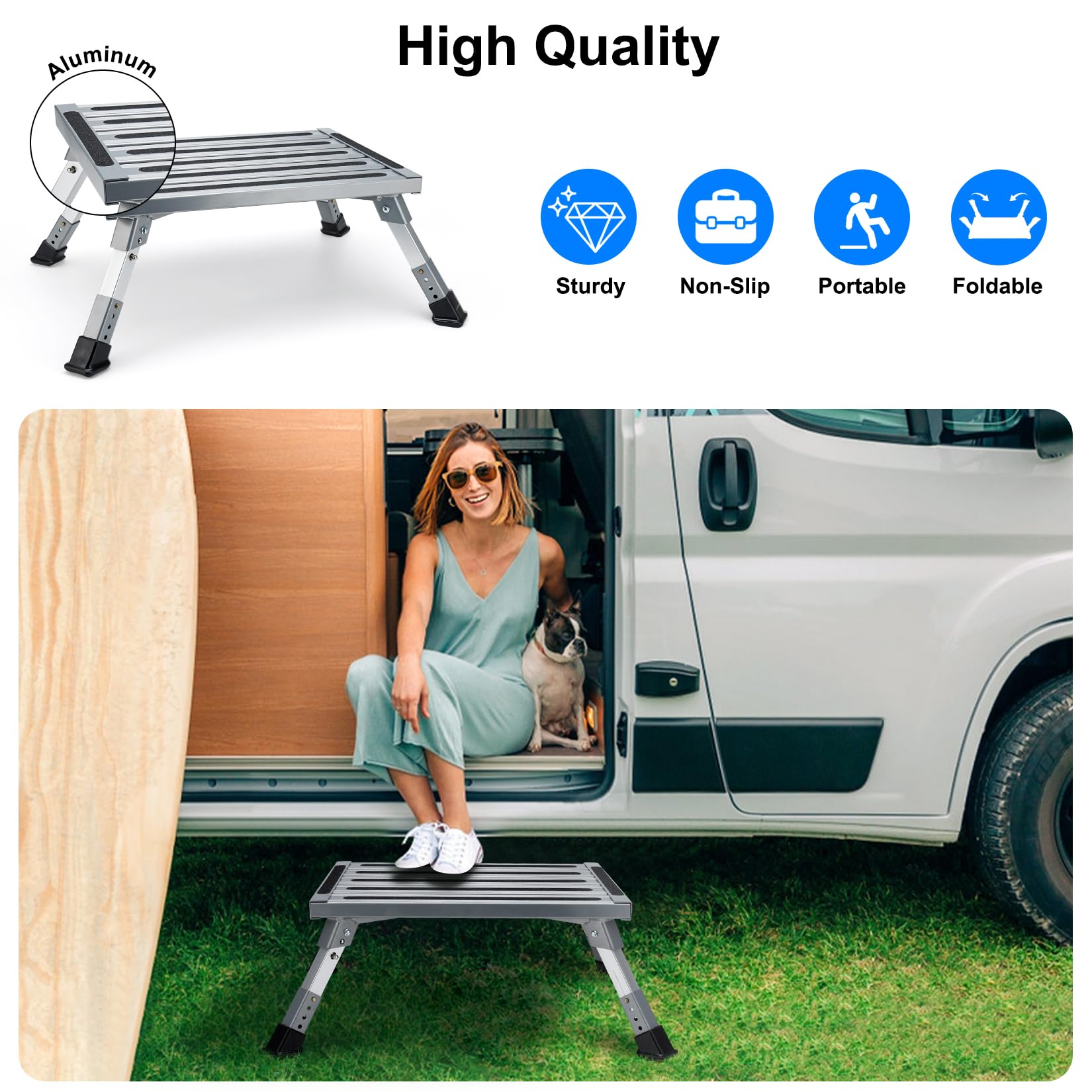 Vielseitige Höhenverstellung: Erleben Sie Komfort mit unserer faltbaren Wohnmobil-Stufe mit vier höhenverstellbaren Hockerbeinen. Sollten Probleme bei der Verwendung dieses Wohnmobil-Tritthockers auftreten, zögern Sie nicht, sich zu kontaktieren. Verbesserte Sicherheit mit Anti-Rutsch-Funktionen: Die Platte unseres Wohnmobil-Tritthockers für Reiseanhänger ist mit Anti-Rutsch-Streifen ausgestattet, ergänzt durch Gummi-Anti-Rutsch-Ecken unter den Hockerbeinen. Produktmerkmale: Größe: 48,3 x 36,8 cm Material: Aluminium. Diese Kombination liefert überlegene Reibung und Stabilität, wobei Ihre Sicherheit während des Gebrauchs priorisiert wird Mit einer 2-jährigen sorgenfreien Garantie und Online-Support rund um die Uhr verpflichtet sich Risornda dazu, Seelenfrieden und zufriedenstellende Lösungen für Ihre Wohnmobil-Tritthocker zu bieten. Wir verpflichten uns, eine zufriedenstellende Lösung zu bieten, die Ihren Bedürfnissen entspricht Tritthocker grün 36,5 x 30 x 24 cm Tritt DEASY Badematte Teakholz Badematte 80x48cm Mt Rutschfesten Gummfüßen Leiter 4 Stufen Verbesserte Sicherheitsmerkmale umfassen Anti-Rutsch-Streifen und Gummiecken auf der Platte, die die Stabilität priorisieren. Stellen Sie mühelos die gewünschte Höhe ein, indem Sie die Einstellknöpfe auf beiden Seiten der Wohnmobil-Stufenhockerbeine drücken, was sowohl Erwachsenen als auch Kindern einen einfachen Zugang für Erwachsene und Kinder bietet, die das Wohnmobil betreten Berger Caravan Step Tritthocker - Fritz Berger Campingbedarf Dieses robuste Design rt ein erhöhtes Maß an Sicherheit für Ihre Familie Böcker Maurer-Treppe - 4-Stufen online kaufen