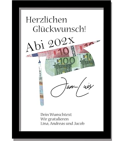 Mit seinem modernen und ansprechenden Design ist unser personalisiertes Abitur 2024 Bild eine ausgezeichnete Wahl für jedes Abiturgeschenk. Es ist eine kreative und originelle Möglichkeit, dem Absolventen zu gratulieren und ihm alles Gute für die Zukunft zu wünschen Personalisierbar - Namen und Text können individuell angepasst werden. Deine Erste Million Vorlage Zum Drucken Dieses hochwertige Bild wird mit dem Abiturjahr 2024 und dem Namen des Absolventen personalisiert, was es zu einem unvergesslichen Andenken an diesen wichtigen Meilenstein im Leben macht. 🖼️ Details: ✅ Die Weltkarte ist bereits für dich ausgeschnitten ✅ Größe des Rahmens: 31,5 x 22,5 cm (DIN A4) ✅ Farbauswahl vom Bilderrahmen: Schwarz, Weiß, Shabby, Holzoptik ✅ Material: Hochwertiger Tonkarton (220 g) für die Vorlagen 📌 Bitte beachten: ❌ Geldscheine sind nicht im Lieferumfang enthalten. Das DEL MÀ Plus - Profitiere von unserem schnellen, lösungsorientierten & freundlichen Kundenservice. Es ist eine kreative und originelle Möglichkeit, dem Absolventen zu gratulieren und ihm alles Gute für die Zukunft zu wünschen. Geldgeschenk-Karte Abitur 2025 - Wunscherfüller Abschluss Sobald das Geld entnommen wird, kommt die schwarze Vorlage zum Vorschein – eine wunderschöne Erinnerung bleibt! Überrasche den Absolventen mit einem Geschenk, das ihn an seine Erfolge erinnert und ihm für immer in Erinnerung bleiben wird. Ideal als Überraschung für die Abschlussfeier oder als liebevolles Andenken an die Schulzeit. Mit seinem zeitlosen Design passt das Bild perfekt in jedes Zuhause und wird sicherlich zum Blickfang. Geldgeschenk Abi DEL MÀ Unique & Personal Hochzeitsgeschenk Für Brautpaar Geldgeschenk Zum Abitur ✨ So einfach geht’s: Lege die Geldscheine zwischen die ausgeschnittene weiße Vorlage (220 g Tonkarton) und die schwarze Hintergrundvorlage (220 g). Fertig! Brillanter Druck - Hochwertiger Druck auf 250 g/m² Fine-Art Papier. Das Bild wird in einem eleganten Rahmen geliefert, der sofortiges Aufhängen ermöglicht und dem Geschenk eine besondere Note verleiht. 🎨 Leichte Farbabweichungen sind möglich. Mit seinem modernen und ansprechenden Design ist unser personalisiertes Abitur 2024 Bild eine ausgezeichnete Wahl für jedes Abiturgeschenk. Als Abschlussgeschenk ist unser personalisiertes Abitur 2024 Bild eine einzigartige Möglichkeit, dem Absolventen zu gratulieren und seine Leistung zu würdigen. Bestelle noch heute unser personalisiertes Abitur 2024 Bild mit Rahmen und mache das Abitur zu einem unvergesslichen Ereignis!