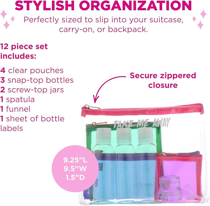 Robuste Tasche mit Reißverschluss. Das Leben ist eine Reise., Gut verpacken. Stilvolle Organisation: Dieser transparente Kulturbeutel ist die perfekte Kombination aus Stil und Funktion. Dieses Miamica Toilettenartikel-Set hilft dabei, Ihre Schönheitsprodukte organisiert und sicher zu halten. Flaschen Zum Basteln Badezimmer Miamica Transparentes Flaschen-Set Für Damen, 19,1 X 16,5 X 3,2 Cm (L X B X T), Einheitsgröße, Rosa (L X B X T Deko Flaschen Für Wohnung Enthält 12 Teile: Dieser Reise-Kulturbeutel für Damen hat insgesamt 12 Teile, um Ihre Produkte sicher aufzubewahren: 1 transparenter Kulturbeutel, 8 verschiedene Reiseflaschen und Schraubverschluss-Gläser, 1 Spatel und 1 Trichter. Es ist eine robuste, tragbare Reise-Kulturtasche mit Reißverschluss. Während die Behältergrößen variieren, sind alle unter 85 g. Dieses Miamica-Flaschen-Set hilft dabei, Ihre Schönheitsprodukte organisiert und sicher zu halten. Das Reiseflaschenset hat insgesamt 8 Stück:4 nachfüllbare, wiederverwendbare Flaschen mit abnehmbaren Kappen, Mini-Trichter und Spatel zum einfachen Befüllen und eine Reisetasche zum Aufbewahren Bei Miamica sind wir leidenschaftlich für Reisen, Verpacken und Organisieren und haben es uns zur Aufgabe gemacht, die modischsten, funktionalsten und lustigsten Accessoires zu kreieren. MIAMICA Bei Miamica sind wir leidenschaftlich für Reisen, Verpacken und Organisieren. Der mitgelieferte Spatel und der Trichter ermöglichen ein einfaches Umfüllen von Beauty-Produkten. Robustes Design: Mit den Maßen 19,1 cm L x 16,5 cm B x 3,2 cm T. Miamica TSA Compliant Reiseflaschen und Kulturbeutel-Set, 4-teilig TSA-konformes Kulturbeutel: Dieser Miamica TSA-konforme Reise-Kulturbeutel hilft dabei, Ihre Schönheitsprodukte organisiert und sicher für Ihr nächstes Abenteuer zu halten. Die Kulturtasche hat insgesamt 12 Teile, um Ihre Produkte sicher aufzubewahren: einen transparenten Kulturbeutel, acht verschiedene Flaschen und Gläser mit Schraubverschluss, ein Spatel und ein Trichter. Maße (L x B x T): 19,1 x 16,5 x 3,2 cm. Diese Reise-Kulturbeutel hat die perfekte Größe. Es ist eine robuste, tragbare Reise-Kulturtasche mit Reißverschluss Diese Reise-Kulturbeutel hat die perfekte Größe. Maße (L x B x T): 19,1 x 16,5 x 3,2 cm. Unsere innovativen Produkte bieten die ultimativen Lösungen, um den Inhalt in Ihrem Handgepäck, Koffer, Sporttasche oder Handtasche zu organisieren.