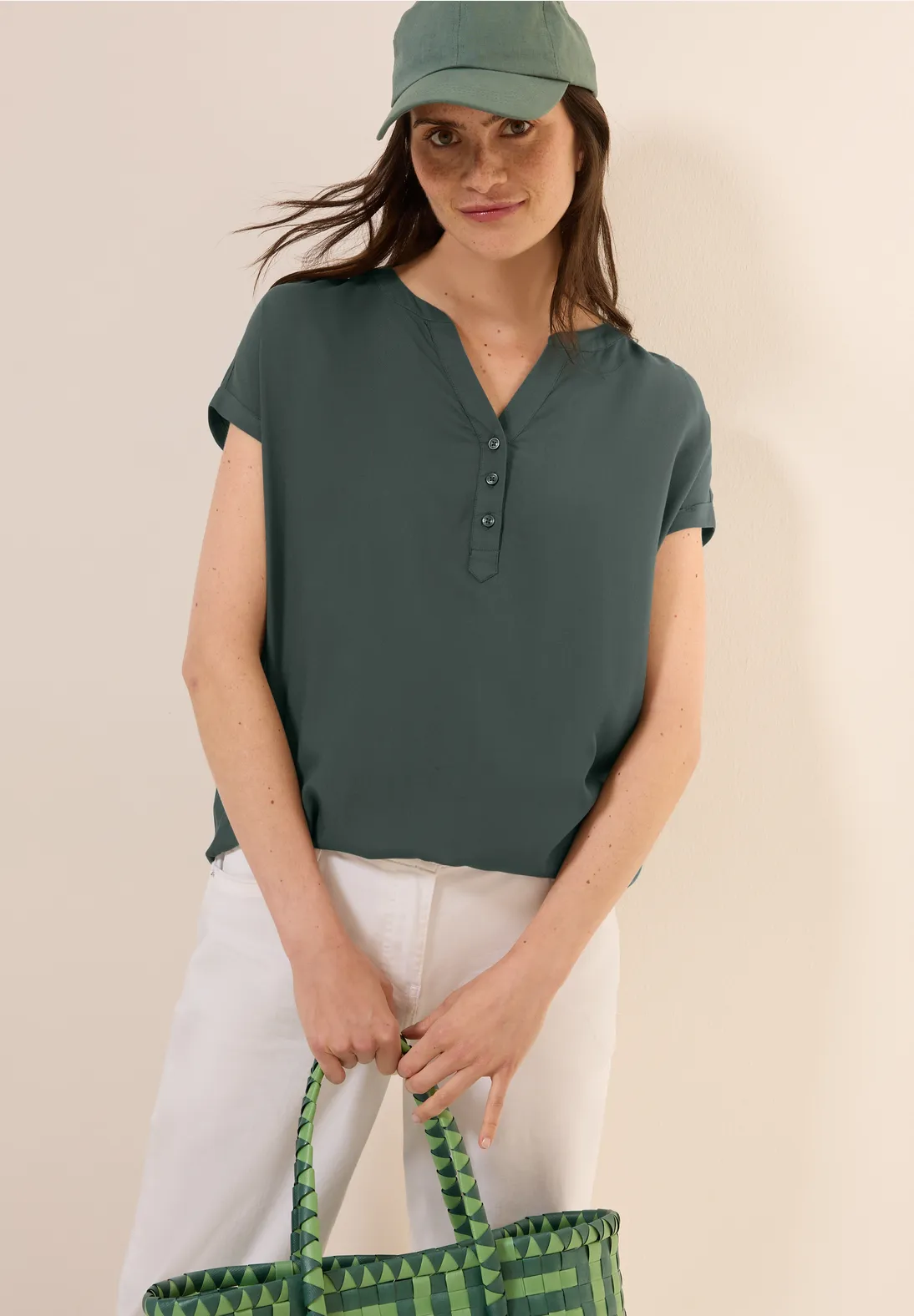 Cecil Shirt mit Kurzarm, Flammgarn Optik und abgerundetem V-Ausschnitt Mehr als nur Basic! Basic Shirt für Damen in Beige Bereits ab 19,56 € Große Shopvielfalt Testberichte & Meinungen | Jetzt Cecil Kurzarmshirt strong khaki günstig kaufen bei Cecil Deutschland Damen B319373 Basic Kurzarmshirt, Easy Khaki, S Cecil Damen Hierbei erstrecken sich unsere CECIL Modelle über Styles mit Rundhals- oder V-Ausschnitt, modischen Prints und Mustern oder mit diversen Applikationen wie Tunnelzügen, Crash Optiken oder Knotendetails. Egal ob im lässigen Oversize-Look, schlicht mit Rollkragen oder im sportiven Hoodie Style, hier finden Sie den perfekten Alltags-Look für jede Situation. Finden Sie bei CECIL Ihr Lieblingsteil, das Sie das ganze Jahr über begleitet: im Sommer als cooles Statement-Shirt oder als klassisches Basic Top zu Jeans – und wenn die Sonne sich mal weniger zeigt, einfach unter der Jeans- oder Stickjacke als Eyecatcher gestylt und fertig! Das Damenshirt ist ein Allrounder als Single oder Unterziehshirt und gehört in jeden Kleiderschrank Zu unserem vielfältigen Sortiment zählen unter anderem T-Shirts, Shirts in Kurzarm, Langarm oder 3/4-Arm Varianten, Tops und Shirtjacken. Bis zu 30% reduziert Cecil Kurzarm Basic-Shirts für Damen online kaufen bei » Große Auswahl Aktuelle Trends Beliebte Marken Top Qualität » Jetzt entdecken & shoppen Cecil Shirt mit Kurzarm, geschlitztem Rundhalsausschnitt und zweifarbigen floralem Muster Das Damenshirt hat einen hohen Tragekomfort durch den angenehmen Baumwoll Modal Mix Die Marke Cecil hat eine casual/sportive Ausrichtung, Neukundinnen empfehlen wir eine Größe kleiner zu bestellen