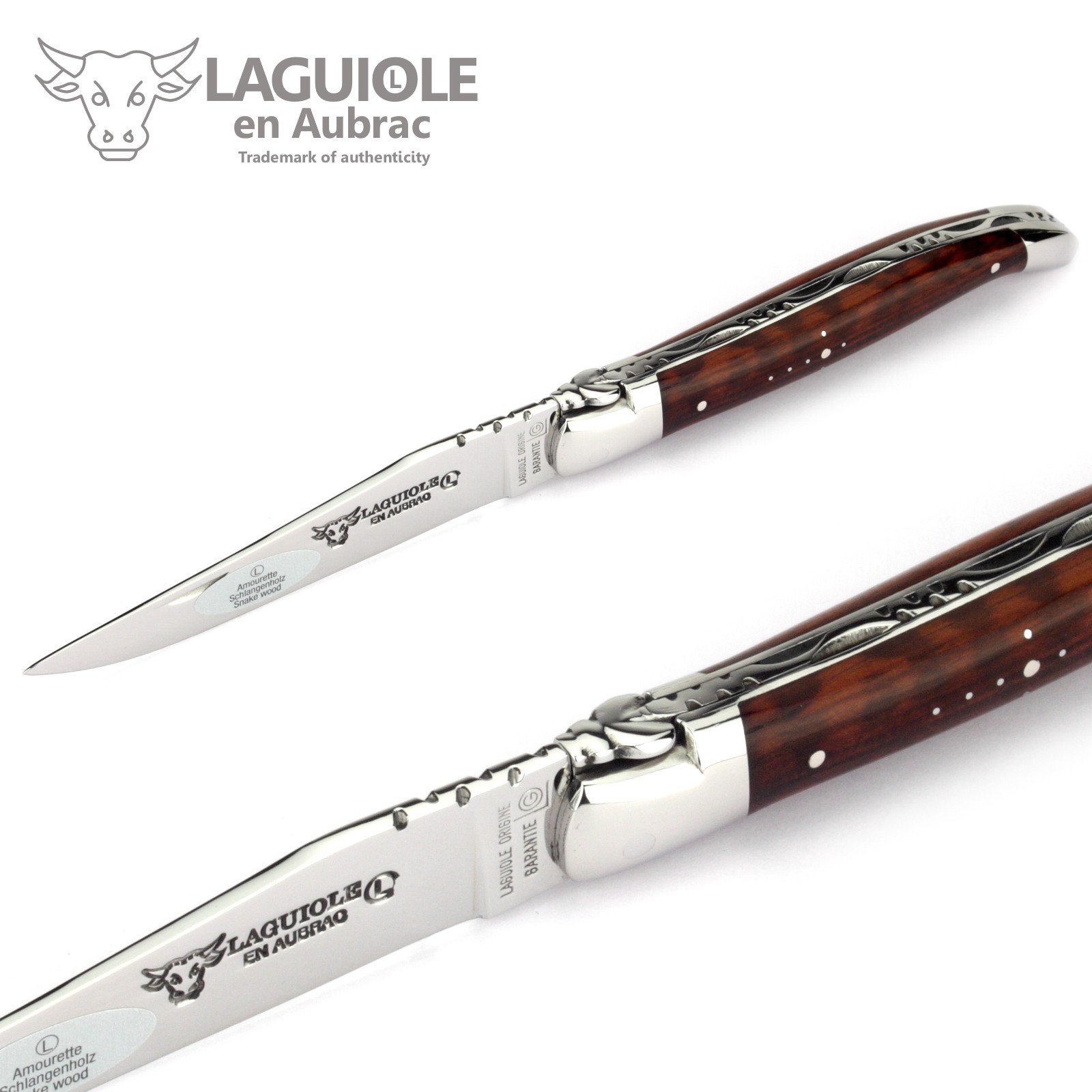 En Aubrac Forge De Laguiole Collection Taschenmesser - 12 Cm - Griff G David In sie ist das bekannte Logo der Schmiede eingeprägt. Messer mit Amourette-Griff, größte Auswahl an Laguiole- und Thiers Griff: 12 cm - Griffschalen Schlangenholz Amourette - Backen: glänzend Da es sich bei diesem Artikel um handgefertigte Originale aus Naturmaterial handelt, kann es zu Abweichungen zwischen den gezeigten Produktbildern und der gelieferten Ware kommen. Laguiole Kellnermesser Prestige Biene Griff Schlangenholz Heft: Griffschalen heller Knochen 12 cm. Klinge: 10 cm glänzend - T14 Stahl aus Frankreich Die beiden Edelstahlbacken und die aus einem Stück geschmiedete Feder und Biene sind ebenfalls hochglänzend ausgeführt. An der Klingenwurzel ist entweder der Schriftzug 'LAGUIOLE ORIGINE GARANTIE LOG' oder seit Ende 2019 der Schriftzug 'FABRIQUE A LAGUIOLE FRANCE' zusammen mit der Stahlsorte eingeprägt. Die glänzend polierte Holzoberfläche harmoniert besonders schön mit den hochglänzend ausgeführten Stahlteilen des Messers. Herstellerkennung: Forge de Laguiole - 1212F INAMBRI - Qualität 'Collection' mit besonders schön handverzierter Biene und Feder Edles Laguiole Taschenmesser aus der bekannten Schmiede Forge de Laguiole. Es hat besonders schöne, handgefeilte Verzierungen. Dieses Holz wird auch Amourette genannt und stammt aus Südamerika. Die Griffschalen sind aus rotbraun geschecktem, auffälig gemasertem Schlangenholz. Dieses Holz wird auch Amourette genannt und stammt aus Südamerika. Die glänzend polierte Holzoberfläche harmoniert besonders schön mit den hochglänzend ausgeführten Stahlteilen des Messers Die 10 cm lange Klinge ist aus französischem T14 Stahl gefertigt.