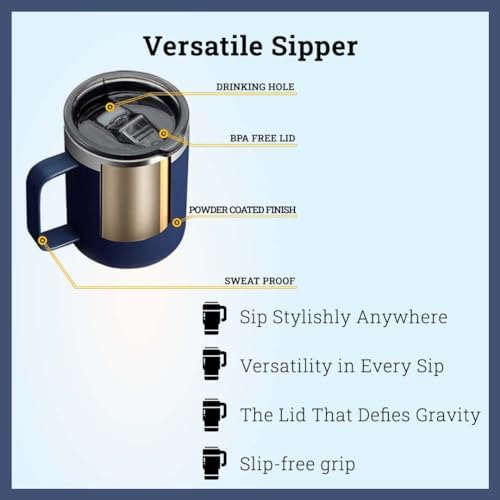 Besonderheiten: praktischer Deckel und Griff. ONEKLIK Doppelwandiger Vakuumbecher – auslaufsicherer und BPA-freier Deckel, 304 18/8 pulverbeschichteter Edelstahl-Thermokaffeebecher – isolierter Becher mit Deckel hält Getränke heiß und kalt, tiefblau – 12 Unzen. Es wird alle Ihre Flüssigkeitsbedürfnisse befriedigen. Es dient als bester Begleiter bei der Arbeit, auf Reisen und bei Outdoor-Aktivitäten wie Camping und Picknicks. Aber auch als Reisebecher eignen sie sich gut. Travel Mug Oneklik Thermobecher Mit Henkel, Kaffeebecher Mit Deckel, Kaffee Thermobecher Auslaufsicher, Reisebecher 12 Unzen Schwarz Kaffee To Go Becher Contigo Streeterville Desk Mug, isolierter Kaffee-Thermobecher mit Henkel aus Edelstahl, Coffee to go Becher mit Deckel, hält Kaffee und Tee bis zu 5 Stunden warm, ideal fürs Büro & Zuhause, 420 ml Dieser sorgfältig gefertigte Reisebecher mit Henkel bietet neben einer eleganten und schönen Ästhetik eine außergewöhnliche Leistung, die Ihre Getränke über längere Zeiträume heiß oder kalt hält. Dieser Thermobecher aus hochwertigem Edelstahl begleitet Sie zuverlässig durch den Tag, egal ob auf Reisen, im Büro oder beim Outdoor Abenteuer. Die ideale Wahl für stilvolle Funktionalität und anhaltenden Genuss, dank dem robusten und langlebigen Design Produktdetails: ✔ Produkt: Edelstahlbecher ✔ Marke: ONEKLIK ✔ Farbe: Dunkelblau., ✔ Material: Edelstahl 304 18/8., ✔ Funktion: Hält Getränke heiß und kalt., ✔ Oberfläche: Pulverbeschichtet Die langlebige und robuste Konstruktion dieses Kaffee-Thermobechers sorgt dafür, dass er dem täglichen Gebrauch standhält, egal ob Sie an Ihrem Morgenkaffee nippen oder an einem heißen Sommertag ein eiskaltes Getränk genießen. Verabschieden Sie sich von lauwarmem Kaffee und verdünntem Eisgetränk. Dieser Reisebecher mit Henkel verfügt über eine elegante Pulverbeschichtung, die nicht nur schön aussieht, sondern auch das Halten erleichtert. Es ist ein problemloser Begleiter, egal ob Sie zur Arbeit laufen oder eine Wanderung unternehmen. ✔ Pulverbeschichtete Oberfläche ✔ Doppelwandige Vakuumisolierung ✔ Leicht zu reinigen. MB Essentials Thermobecher mit Strohhalm & Henkel – 1200ml Edelstahl Becher to go | Isolierter Tumbler mit Deckel & Griff | für warme & kalte Getränke | Geschenkidee (Beige Die geschmeidige Textur verleiht Ihrem regelmäßigen Trinkbegleiter einen Hauch von Eleganz. Lassen Sie uns die unglaublichen Eigenschaften dieses nachhaltigen Isolierbechers erkunden. Mit dem OneKlik Thermo-Reisebecher als Teil Ihrer täglichen Routine müssen Sie sich nie wieder mit weniger als perfekt gekühlten oder heißen Getränken zufrieden geben.