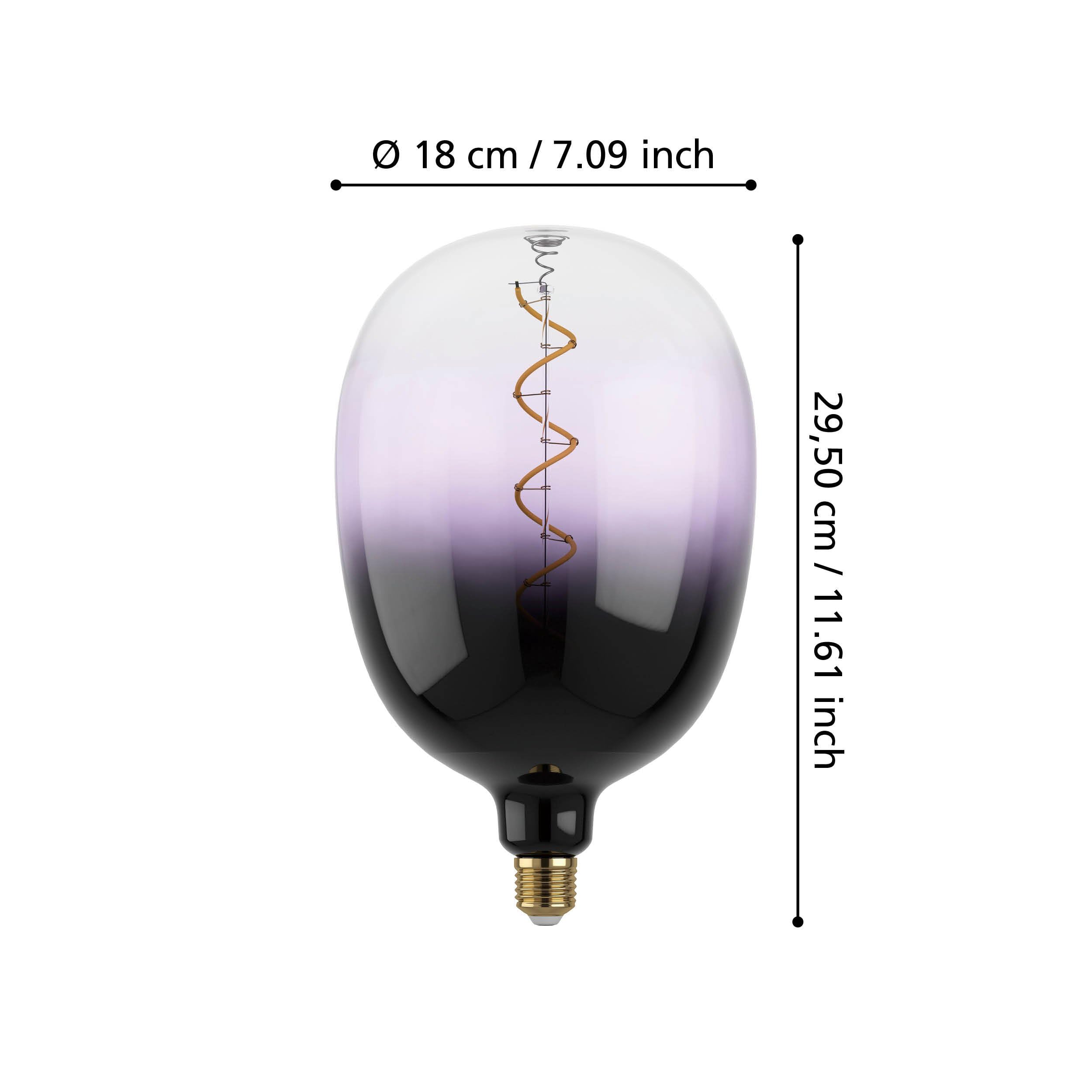 Vintage Deko EGLO E27 Lape Dibar, Spiral LED Glühbirne Globe, Glühbirne E27 Vintage Groß EGLO XXL E27 Lampe dimmbar, Spiral LED Retro Glühbirne Big Size, extra-großes Vintage Deko Leuchtmittel aus Rauchglas, 4 Watt, 100 Lumen, warmweiß, 2000 K, L 25,5 cm Mit einer Leistung von 4 Watt und der G190 Apfel-Form eignet sich dieses übergroße Deko-Leuchtmittel ideal für Leuchten mit E27-Fassung, wie Tischleuchten, Stehleuchten oder dekorative Leuchten; Abmessung: Länge: 25,5 cm, Durchmesser: 19 cm Mit ihrem angenehmen, gedämpften Licht setzt das dekorative Spiral-Leuchtmittel einen besonderen Lichtakzent und sorgt so für eine gemütliche Wohlfühlatmosphäre; Beachte, dass sich dieses Leuchtmittel aufgrund der geringen Lichtleistung (40 Lumen) nicht eignet, um einen Raum optimal auszuleuchten Granddad Led Spiral Filament Bulb E27 - XXL Led Glühbirne – Edisson Riesen LED Spiral Filament Glühbirne A165 5W E27 gold gelüstert extra Die Lieferung erfolgt hier im praktischen 2er-Set. Mit einer extra langen Lebensdauer wird Ihnen diese Glühlampe außerdem noch viele Jahre Freude bereiten und ist dank der Standard E27 Fassung in vielen Hängelampen, Stehleuchten oder Deckenstrahlern einsetzbar. Die LED-Glühbirne spendet angenehmes warmweißes Licht (2000 Kelvin) und ist dimmbar (Bitte berücksichtige die jeweiligen Dimm-Eigenschaften deiner Leuchte) Im Innen leuchten die Filament Glühfäden und erschaffen so den beliebten Industrial Retro Look, welcher einer alten Glühbirne täuschend ähnlich ist, aber mit langlebiger und sparsamer LED Technik glänzen kann.