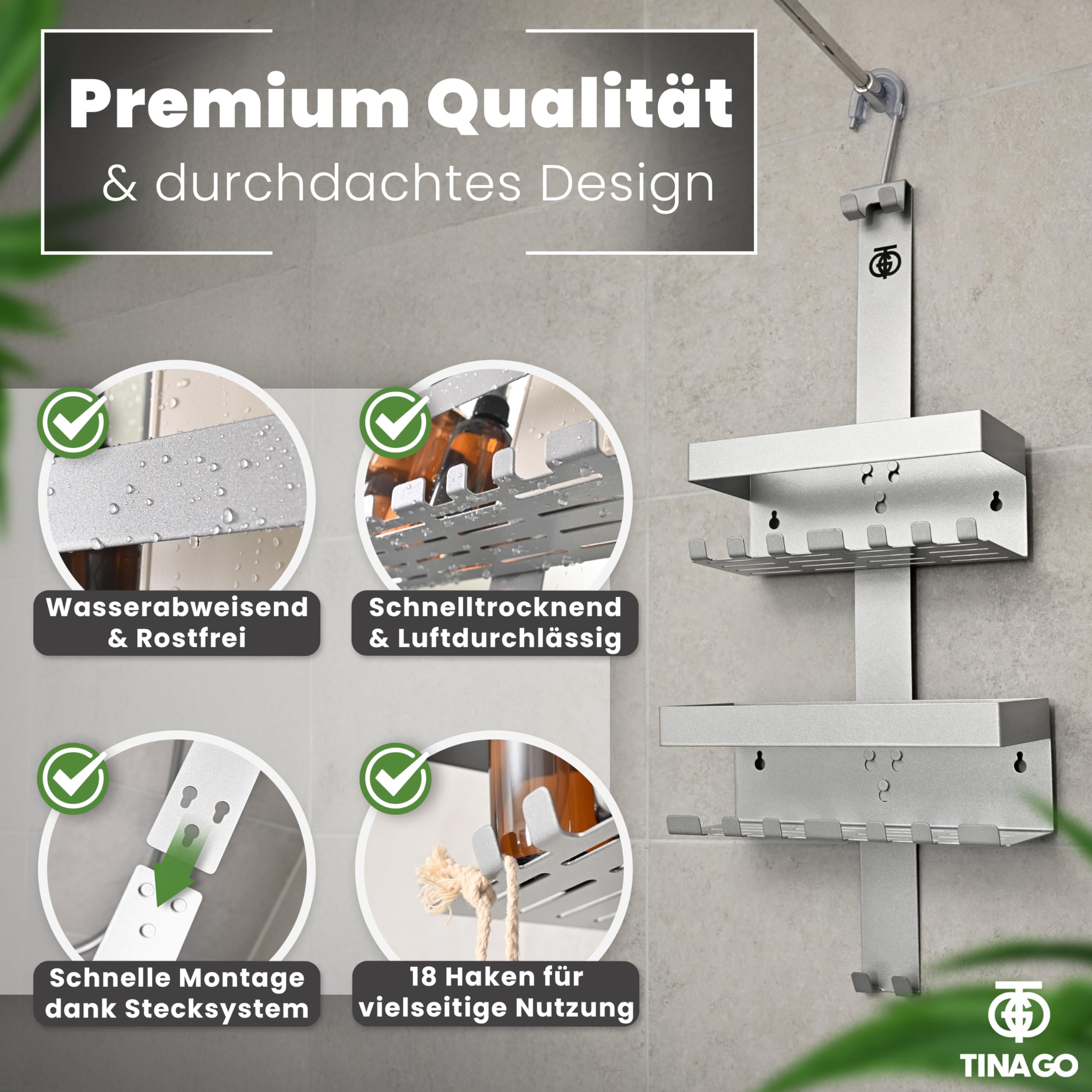 𝗞𝗢𝗠𝗣𝗔𝗞𝗧𝗘 𝗔𝗕𝗠𝗘𝗦𝗦𝗨𝗡𝗚𝗘𝗡 – Die Duschablage hat eine Gesamthöhe von 70 cm und bietet zwei praktische Ablagefächer für Duschutensilien. Praktisch, flexibel und zuverlässig, für jede Herausforderung gewappnet! Badezimmer Organizer Rutaqian Duschablage Duschablage/Duschregal Ohne Bohren, Badezimmer Badezimmer Upgrades Kein Werkzeug, kein Lärm, kein Staub. Genießen Sie eine mühelose Montage. 𝗥𝗢𝗦𝗧𝗙𝗥𝗘𝗜𝗘𝗦 𝗠𝗔𝗧𝗘𝗥𝗜𝗔𝗟 – Gefertigt aus hochwertigem, rostfreiem Material, das für Langlebigkeit und Zuverlässigkeit sorgt. Die Duschablage bietet stabilen Halt für all Ihre Pflegeprodukte – modern, robust, einfach montiert. Perfekt für die Aufbewahrung von Spülmitteln, Kochutensilien oder Gewürzen. Duschablage ohne Bohren - einfach ankleben Durch die flexible Hängemontage ist es jederzeit abnehmbar und umplatzierbar, ohne Rückstände zu hinterlassen. Die kleinere Ablage misst 25 cm in der Länge und 9,5 cm in der Höhe, während die größere Ablage 28 cm lang und 10 cm hoch ist. 𝗞𝗢𝗠𝗣𝗔𝗞𝗧𝗘 𝗔𝗕𝗠𝗘𝗦𝗦𝗨𝗡𝗚𝗘𝗡 - Die Duschablage hat eine Gesamthöhe von 70 cm und bietet zwei praktische Ablagefächer für Duschutensilien. Zusätzlich ist ein stabiler 9 cm langer Haken integriert 𝗕𝗟𝗜𝗧𝗭𝗦𝗖𝗛𝗡𝗘𝗟𝗟𝗘 𝗔𝗨𝗙𝗕𝗔𝗨 – Einfacher und stressfreier geht es nicht! Mehr Platz, mehr Stil - mit der TINAGO Duschablage Kennst du das Chaos aus Shampoo-Flaschen, Duschgel und Rasierer am Wannenrand? Schluss damit! Die TINAGO Duschablage zum Hängen bringt Ordnung und Stil in dein Badezimmer - ganz ohne Bohren, ganz ohne Aufwand Genießen Sie ein stilvolles, robustes Produkt, das sowohl praktisch als auch pflegeleicht ist – ideal für Ihr Badezimmer!