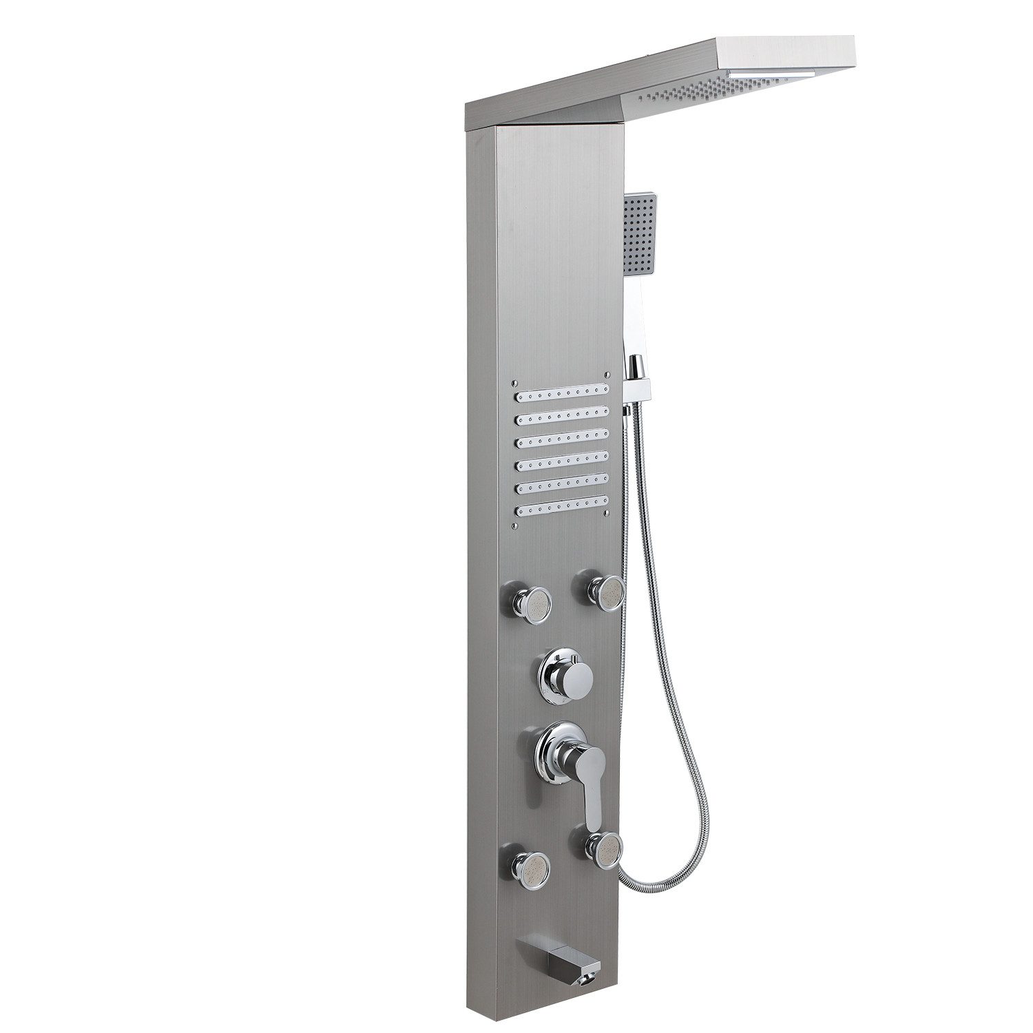 Duschbildschirm mit vier Funktionen: Regen, Wasserfall, Massagedüse und Handbrause, kann leicht durch Knöpfe gewechselt werden Aus Edelstahl, wunderschön gestaltet Größe der Massagedüse (jedes Set): 20,5 x 10,8 cm (Länge x Breite). Duschbildschirm mit vier Funktionen: Regen, Wasserfall, Massagedüse und Handbrause, kann leicht durch Knöpfe gewechselt werden. Breite des Wasserfalls: 12,5 cm. Größe der Handbrause: 2,8 x 2,8 x 21 cm (Breite x Tiefe x Höhe). Größe der Dusche: 23 x 14 cm (Länge x Breite). Edelstahl schwarz Duschpaneel LED Duschset Edelstahl Duschsystem MIT Thermostat Elstahl Duschpaneel Duschsäule Regendusche Massage LED Thermostat Sanlingo Aus Duschpaneel Ohne Armatur Material aus Edelstahl, wunderschön entworfen. Duschabtrennung mit vier Modi: Regen, Wasserfall, Massagedüse und Handbrause, kann leicht durch Knöpfe gewechselt werden Eigenschaften: Regen, Wasserfall, 2 Sets von Massagedüsen, Handbrause 150 Düsen mit Silikon-Düsen: 50 Massagedüsen pro Gruppe Standard-Schlauchanschluss 1/2 Zoll, einfach zu installieren
