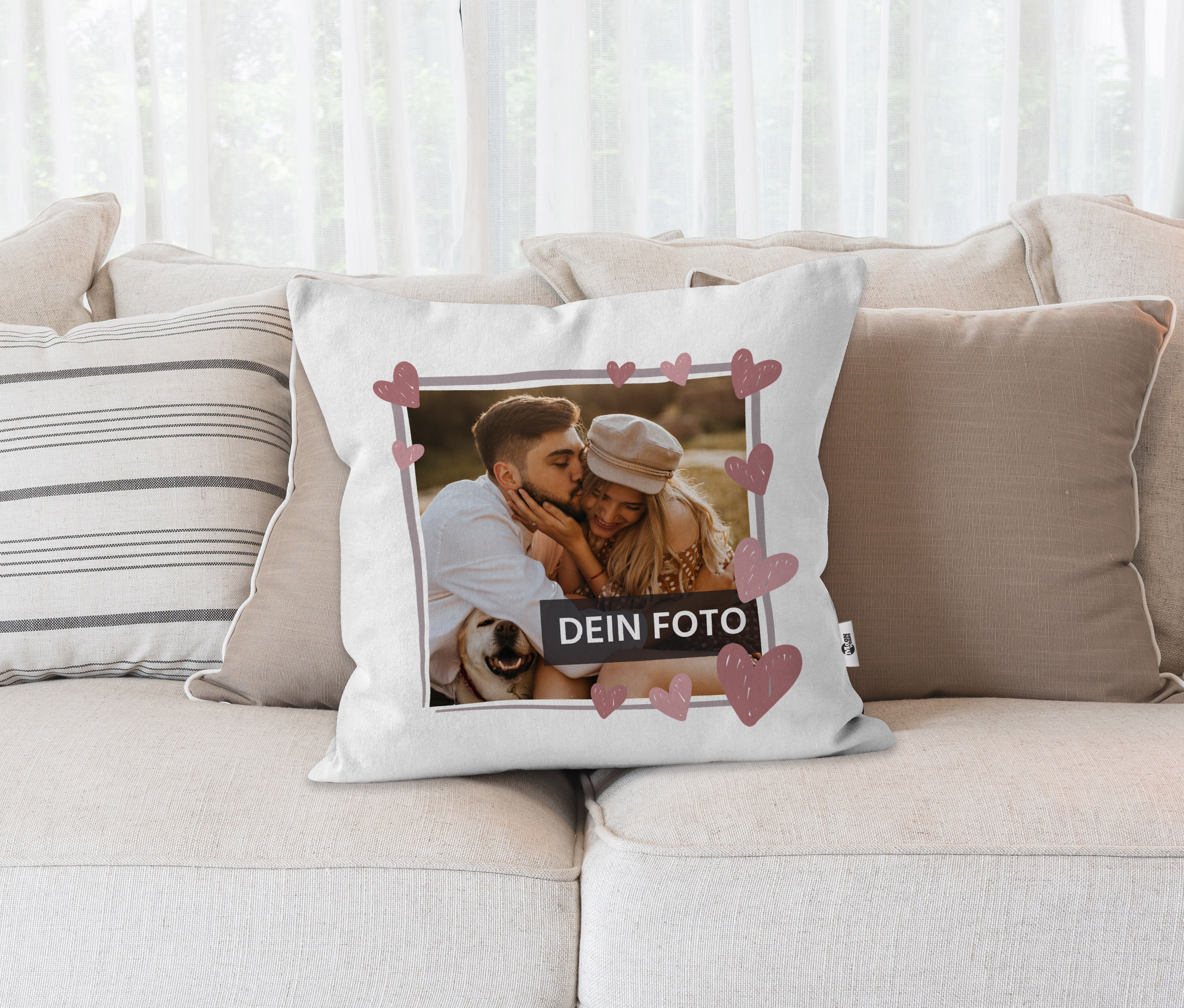 Kissenbezüge mit Bild sind immer präsent und eine wunderschöne Deko für Couch, Sofa und Bett. Jedes Mal, wenn du es siehst oder dich darauf setzt, wirst du von dem besonderen Moment überflutet, den du auf dem Kissen verewigt hast. Achtung: Kissenbezug ohne Füllung! Egal ob Lieblingsfotos, Familienporträts oder spezielle Momentaufnahmen - lass deiner Fantasie freien Lauf und mach das Kissen zu einem Kunstwerk. Kunden zwischen 18 und 50 Jahren schätzen die persönliche Note und den emotionalen Wert, den das Fotokissen mit sich bringt. Hier kannst du deinen Kissenbezug selbst gestalten - und tolle Geschenke für deine Liebsten drucken lassen! So entstehen persönliche, individuelle Geschenke und einzigartige Unikate - ein liebevoller Geschenkartikel nur für dich gemacht! Gestalte dein neues Sofakissen mit deinem Lieblingsbild! Bild hochladen, und/oder eigenen Text mit einer Schriftart und Schriftfarbe deiner Wahl gestalten und fertig ist dein ganz persönliches Fotokissen. Personalisierte Geschenke für jeden Anlass - vom Muttertagsgeschenk bis zum Geschenk zum ValentinstagEin personalisiertes Geschenk ist immer etwas Besonderes. Kissen Mit Eigenem Schriftzug Fotokissen - Kissen Mit Eigenem Foto Bedrucken | CEWE Kissen Mit Foto Zum Ausdrucken bedruckte Kissen mit Fotodruck - Erinnerungen zum KuschelnOb mit Familienfoto als Geschenk für die Oma oder als Weihnachtsgeschenk für Eltern, ein Pärchen-Foto als Geschenk für den Partner, ein Foto von deinem Haustier oder einfach das traumhafte Bild aus dem letzten Urlaub als Souvenir - deiner Kreativität sind keine Grenzen gesetzt! Verschenke zum Beispiel ein Fotokissen mit Geburtsdaten als Geschenk zur Geburt. Alternativ kannst du auch ein persönliches Bild von dir und deinen Liebsten wählen und mit einem persönlichen Spruch ergänzen Unsere Kissen mit Bild werden in Deutschland sozial, fair und in liebevoller Handarbeit bedruckt. Hochwertiger Kissenbezug 40x40 aus robuster, waschbeständiger Baumwolle | Maße: 40 x 40 cm | Material: 100% Baumwolle | Verschluss: Reißverschluss | Maschinenwäsche bei 30°, auf Links waschen Wir halten besondere Momente in Bildern fest, doch oft verstauben unsere Andenken dann in irgendwelche Kisten oder fristen ein tristes Dasein in vernachlässigten Alben. Der Druck ist total, was bedeutet, dass das 100% des Produktes personalisiert wird: Es werden keine Ränder übrig bleiben. Jetzt Kissen selbst gestalten und ein ganz persönliches Geschenk kreieren! Mach das Fotokissen zu einem Teil deines Lebens und verschenke es an deine Liebsten. Ein Kissen, viele Einsatzmöglichkeiten Dank seines vielseitigen Designs passt das Fotokissen in jeden Raum. Fotokissen günstig ab 12,90 € mit Collage bestellen - Kissen bedrucken - Kissendruck Es ist individuell für diese eine Person gefertigt und damit einfach einzigartig! Material: 100% Baumwolle, hautfreundlich & robust Personalisierte Geschenke sind immer eine besondere und persönliche Geschenkidee - halte Erinnerung und wundervolle Momente fest und schenke sie deinen Liebsten! Oder nutze es als dekorative Ergänzung in deinem Schlafzimmer, um eine gemütliche Atmosphäre zu schaffen. Originelle Fotogeschenke jetzt ganz einfach selbst gestalten und Kissen bedrucken lassen - Unter Jetzt anpassen ganz bequem online. Bild hochladen, und/oder eigenen Text mit einer Schriftart und Schriftfarbe deiner Wahl gestalten und fertig ist dein ganz persönliches Fotokissen Kissen sind ein sehr beliebtes Geschenk, denn sie für jeden Anlass geeignet sind: Geburtstage, Valentinstag, Weihnachten, Jubiläen, Muttertag oder Vatertag, usw. Dekoriere, erinnere und genieße jeden Moment mit dem Fotokissen von Wanapix!