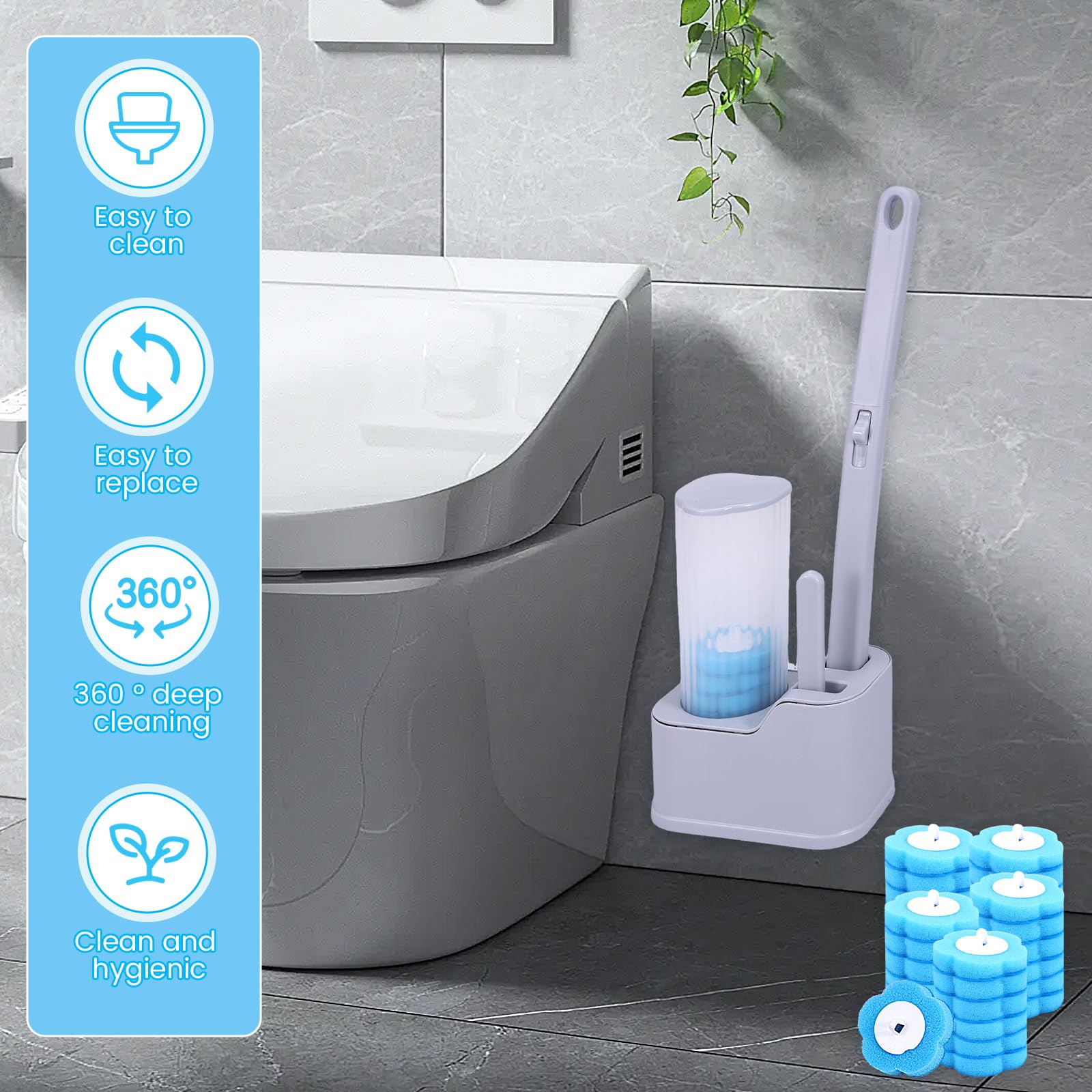 Weg von mühsamen Hausarbeiten. 【Automatisches Öffnen und Schließen】Das Aufnehmen der Bürstenstange öffnet sich automatisch, das Zurücksetzen der Bürstenstange schließt sich automatisch. Transparente und sichtbare Bürstenkopf-Aufbewahrungsbox, die verbleibende Menge ist klar sichtbar, bequem für die tägliche Auffüllung. Der gesamte Prozess ist berührungslos. Einfach zu Bedienen: Erweitertes Griffdesign für einen komfortablen Griff und verhindert das Spritzen von Schmutzwasser auf die Hände. 【Weit verbreitet】Toilettenbürste einmalgebrauch kann verwendet werden, um die Badezimmer-Toilette, Spiegel, Badewanne, Glas, Waschbecken und andere Ecken zu reinigen. Produktmerkmale: Einweg Klobürste Set: Enthält einen Bürstenstange, ein Bürstenkopf Aufbewahrungsetui, 8-austauschbare Schwamm Bürstenköpfe, eine Aromatherapie Tablette und einen Nicht markierender Klebstoff. Zero Bürste Wc Toilettenbürste Zum Einmalgebrauch, Disposable Toilet Cleaning System, Disposable Toilet Brush & Holder Set, Toilet Wand Kit, With 24-Piece Replacement Sponge Brush Heads,blau Einweg Klobürste Dieses Toilettenbürstenset enthält 1 Reinigungsstab, 1 Aufbewahrungsbox und 18 Einweg-Schwammbürstenköpfe. Wandmontiert. Die Toilettenbürste wird mit 18 Nachfüllungen geliefert. Sie können sie überall hinstellen, wo es für Ihr tägliches Leben sehr praktisch ist. Sauber und hygienisch Es ist weich und beschädigt die Oberfläche der Toilette nicht, und der abgerundete Kloreiniger Pads passt perfekt an schwer zugängliche Stellen für 360° Sauberkeit. Toilettenbürste zum Einmalgebrauch, Disposable Toilet Cleaning System, Einweg Toilettenbürste Kit mit 12 Ersatzköpfen, Toilettenbürste mit Halter, WC Bürste Reinigungsmittel für Badreinigung (Blau 【Hochwertiges Leben】Klobürste mit Randreiniger,keine Notwendigkeit, zu bohren, kein Schaden an der Wand; ausgestattet mit nicht markierenden Aufklebern, schönere Installation. Toilettenbürste zum Einmalgebrauch
