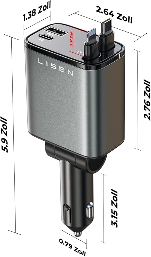 ANPULES Dual Coils Schnelles Kabelloses Autoladegerät, Sart Qi... Es verbindet sich mit 12 V bis 24 V Gleichstrom-Steckdosen und ist somit für die meisten Autos und LKWs geeignet Dieses einziehbare Autoladegerät USB C enthält eine 15A-Sicherung, um Überladung und Überhitzung zu verhindern, um ein sicheres, schnelles Laden zu gewährleisten Die robuste Konstruktion macht dieses USB C Autoladegerät für den täglichen Gebrauch geeignet. Robust und langlebig: Das Kabel ist widerstandsfähig gegen Beschädigungen und Brüche und korrodiert oder oxidiert nicht, sodass es immer wie neu aussieht. Es ist ein ideales Autoladegerät für lange Reisen und passt zu jedem Fahrzeugzubehör 【Stecker einstellen】Verwenden Sie die 180-Grad-Schwenkfunktion, um eine stabile Verbindung zu gewährleisten, auch wenn die Straße holprig wird. Zuverlässige Spannungsüberwachung: Ein eingebauter Spannungsmonitor zeigt Echtzeit-Ladeausgang für eine sichere und effiziente Stromversorgung. Merkmale: Schnelles Laden: Mit Power Delivery 30 W und Quick Charge 3.0 laden Sie Ihre Geräte blitzschnell auf. Ziehen Sie das Kabel nach dem Gebrauch zurück: Ziehen Sie nach dem Aufladen vorsichtig an der Schnur, um es einzuziehen, damit Ihr Autoinnenraum für die nächste Reise ordentlich und organisiert bleibt. 12v Usb Adapter Auto Einziehbares Auto Ladegerät 100W, 4 In 1 Zigarettenanzünder USB Auto Ladegerät Mit IPhone & Typ Ladegerät Zigarettenanzünder Das einziehbare Typ-C-Kabel erstreckt sich bis zu 1,2 m, reduziert Kabelsalat und hält Ihren Autoinnenraum organisiert. Nano Kfz-Ladegerät (75W, USB-C Port, Integriertes Dieses kompakte Ladegerät liefert bis zu 75 W über seinen USB C Port und lädt Ihr iPhone oder andere Geräte besonders schnell. Über das eingebaute, einziehbare 45W Kabel können Sie sogar ein Notebook versorgen, während der zusätzliche 30W USB C Port ein Tablet oder iPhone parallel lädt Flexibler 180-Grad-Ladestecker: Dieses USB-C-Autoladegerät verfügt über einen um 180 Grad drehbaren Stecker, der eine stabile Verbindung auch auf rauen Straßen gewährleistet. Perfekter Partner für Reisen: Entwickelt, um 2 einziehbare Schnüre zu sein, 50% länger als andere 4-in-1 einziehbare Autoladegeräte, ist das FLEXINO Auto USB-Ladegerät kompakt und leicht zu tragen, wodurch es ideal für Reisen ist. Bestellen Sie jetzt und erleben Sie die Vorteile eines zuverlässigen und leistungsstarken Ladekabels in der gewünschten Menge. 【Ausziehbares Kabel verlängern】Ziehen Sie das 45-W-Typ-C-Kabel nach Bedarf heraus, bis zu 1,2 m, für flexibles Laden. Gebrauchsanweisung: 【Plug into Power Source】Stecken Sie das Ladegerät in die Zigarettenanzünderbuchse Ihres Autos, kompatibel mit 12 V bis 24 V DC Steckdosen. Es funktioniert als Handy-Ladegerät für das Auto, unterstützt schnelles Aufladen für Ihr iPhone 16, Samsung und andere Geräte