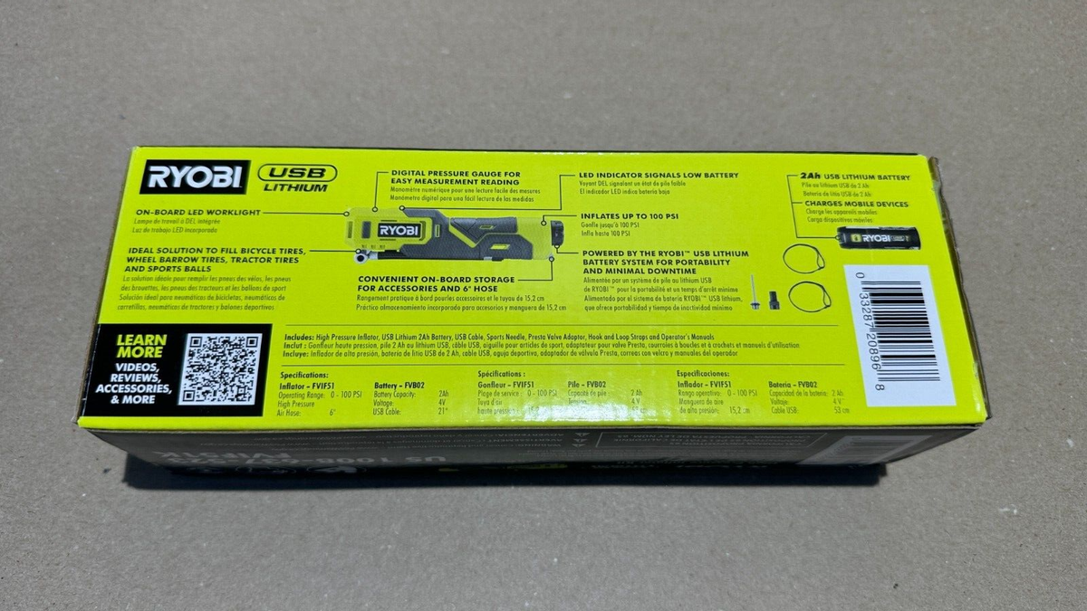 Das USB-Lithium-Hochdruck-Inflator-Kit ist Teil des USB-Lithium-Systems, das kompakte, tragbare, wiederaufladbare Lösungen für kabellose Leistung und Produktivität bietet. Digitales Manometer für einfaches Messen. nicht in deutscher Sprache). Ideale Lösung für Fahrradreifen, Top-Off-Fahrzeugreifen und Sportbälle. Ideale Lösung für Fahrradreifen, Fahrzeugreifen und Sportbälle. Ryobi stellt das USB-Lithium-Hochdruck-Inflator-Set vor. Praktische On-Board-Aufbewahrung für Zubehör und 15,2 cm Schlauch. Aufblasbar bis zu 100 PSI RYOBI introduces the USB Lithium High Pressure Inflator Kit. With on-board storage, bring the included accessories and 15cm hose for on the go inflation. (1) RI4-120G USB Lithium Inflator body. (1) USB Charging Cable Lässt sich bis zu 100 PSI aufblasen. Dieser USB-Lithium-Hochdruckfüller wird durch die 2-jährige Herstellergarantie von RYOBI unterstützt und enthält (1) FVIF51 USB-Lithium-Hochdruckpumpe, (1) FVB01 USB-Lithium-2-Ah-Batterie, USB-Kabel, Sportnadel, Presta-Ventiladapter und Bedienungsanleitung (evtl. Ideale Lösung für Fahrradreifen, Fahrzeugreifen und Sportbälle Nutzen Sie das digitale Manometer für einfaches Ablesen der Messung und präzises Befüllen. High Volume HOTO Electric Tire Inflator, Akku Kompressor, 2500mAh Technaxx Akku Luftkompressor Tx-157