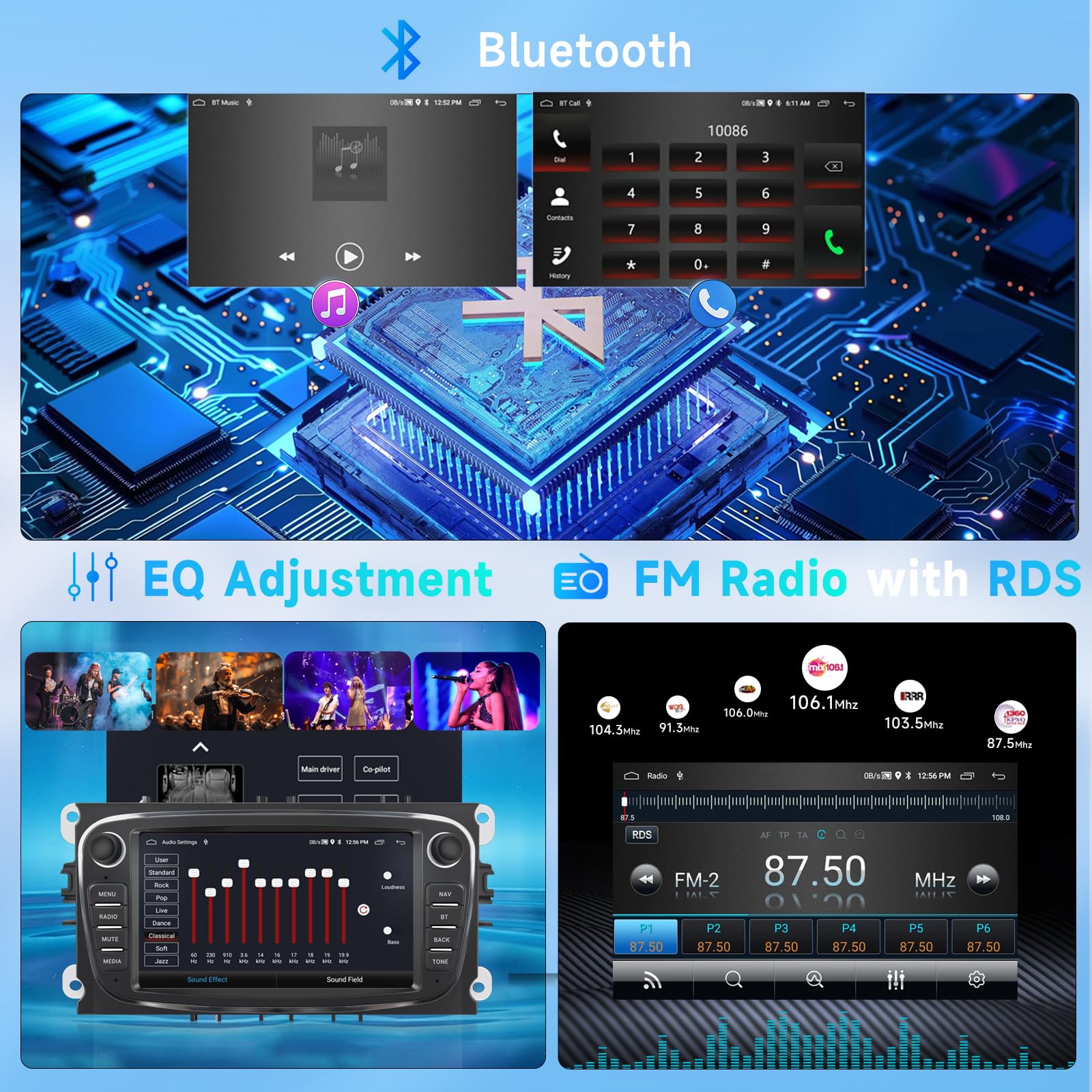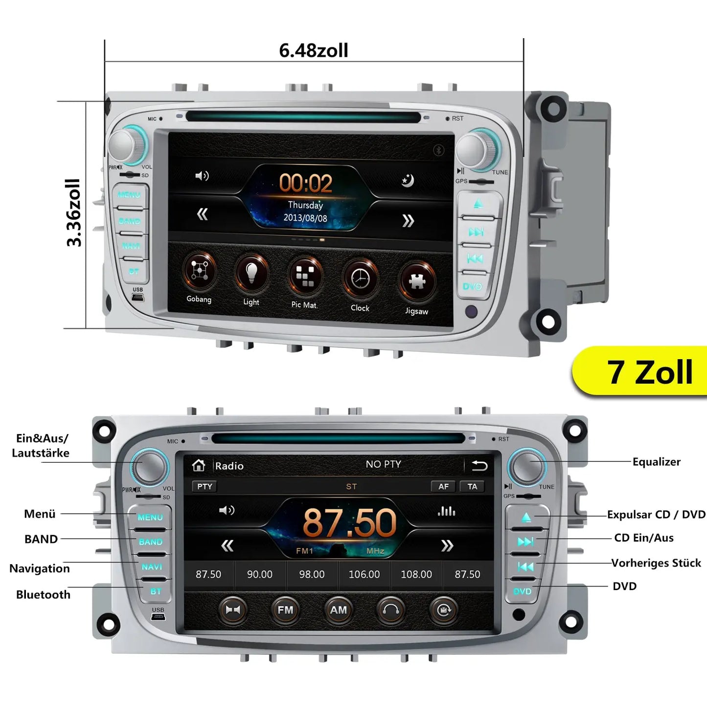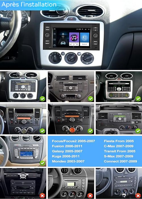 Wireless Carplay & Android Auto & Mirrorlink: Das 2 DIN autoradio für Ford Focus S-Max C-Max unterstützt wireless WiFi-Verbindung Carplay und Android Auto-Funktion, nach erfolgreicher Verbindung können Sie die Handy-Navigation, Mailbox, Adressbuch und andere Software auf dem Auto verwenden, und kann durch Sprache durch Siri oder Goole Assistant bedient werden, so dass Ihre Hände frei werden und eine intelligente Bedienung realisiert wird. 4*45W-Verstärker und 32EQ/DSP sind hinzugefügt, um die Audio-Einstellungsoptionen für Ihr Musikerlebnis zu personalisieren und ein hochwertigeres Musikerlebnis zu genießen., music experience. Das eingebaute GPS-Modul ermöglicht eine WLAN-Verbindung für die Online-Navigation und die Aktualisierung von Verkehrsinformationen in Echtzeit. 1 Intelligente Verbindung 2 Rückfahrkamera & SWC Auch wenn kein Netz vorhanden ist, können Sie die Offline-Navigation durch heruntergeladene Kartenressourcen genießen, ohne sich um Netzsignalprobleme zu kümmern, was ein sorgenfreies Reisen gewährleistet. Android Radio für Ford: Das Autoradio für Ford ist mit dem Betriebssystem Android 13 ausgestattet und bietet ein reibungsloses Nutzungserlebnis. Lenkradsteuerung und Andere: Ausgestattet mit AHD Rückfahrkamera. Nachrüsten von CarPlay ≈ Android Auto a Ford Focus | K I, II, III, IV GONFEN 7 Zoll Android 13 DAB+ Autoradio Für Ford C-ax S-ax Focus... 1 Bluetooth & FM/RDS & DSP 2 7-Zoll-Touchscreen Mit der Mirroring-Verbindung kann der Bildschirm des Mobiltelefons gespiegelt werden. Um diese Funktion zum ersten Mal zu nutzen, müssen Sie die Lenkradsteuerung erlernen. Ausgestattet mit 4GB+64GB und 7 Zoll 1024*600 HD-Display, Unterstützung von WiFi, GPS-Navigation, Split-Screen, Lenkradsteuerung, geeignet für Focus II (2008-2011), für S-Max (2008-2011), für Mondeo 9 (2008-2011),für Galaxy II (2006-2011), für C-Max (2008-2011), für Kuga (2006-2011). Ford Mondeo Mk4 Radio Erisin 7 Zoll 8-Kern 4GB+64GB Android 14 Autoradio CarPlay GPS Navigation Für Ford Galaxy C-Max Focus Mondeo S-Max Kabelloses Android Auto Bluetooth 5.0 WiFi DSP DAB+ OBD USB FM RDS CD Player Galaxy S