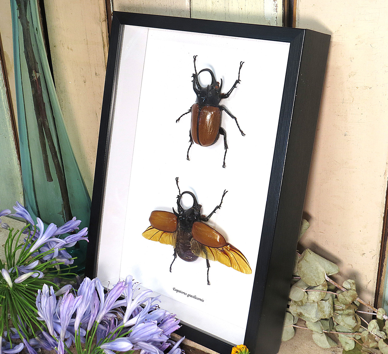 Name tag stating latin name and country of origin Mounted by our in-house entomologist Larvae are released into the wild, in support of the wild population. Handmade wooden frame with hook Here, the insects get the chance to live freely, and reproduce. Suchergebnis Auf Für: Käfer Und Insekten - Bilderrahmen Our insects come from insect-farms all over the world. Echter eingerahmter Nashornkäfer. Tauchen Sie ein in die faszinierende Welt der Insekten mit dieser echten Dekofigur eines Fünfhornkäfers (Eupatorus gracilicornus), präpariert und stilvoll gerahmt Ethically farmed, not taken from the wild Präsentiert wird dieses faszinierende Insekt in einem hochwertigen 25,5 × 25,5 cm Echtholzrahmen mit Echtglas und Passepartout. Dieser Fünfhorn-Nashornkäfer (Eupatorus Gracilicornis) wur von unseren fachkundigen Entomologen in unserem Studio von Hand eingesetzt und elegant in einen tiefen Kastenrahmen in Museumsqualität montiert Eupatorus Gracilicornis Männchen FLUG