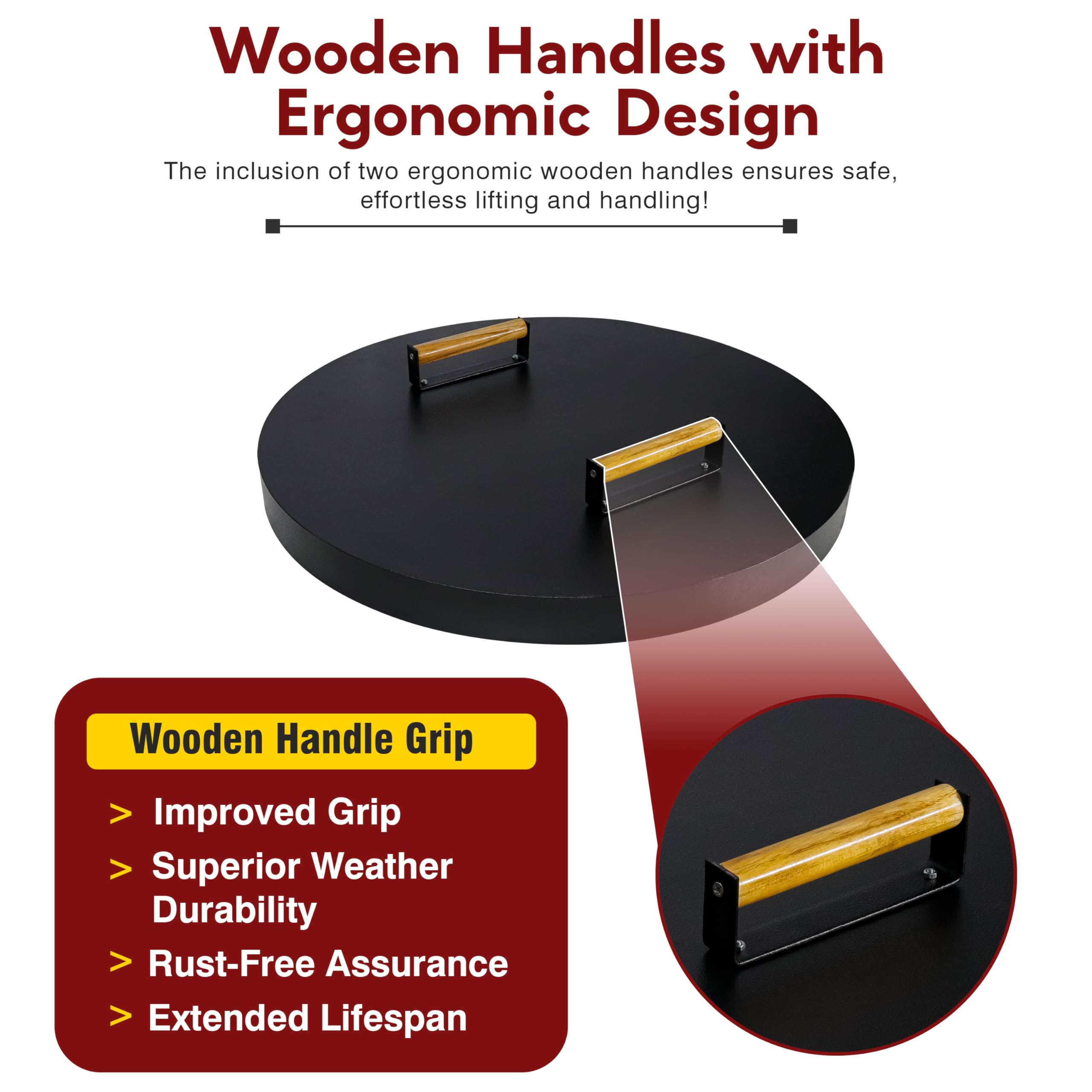 FEBTECH 50,8 Cm Feuerschalendeckel – Kompatibel Mit Rauchfreien Feuerstellen Von 49,5 Cm – Robuste, Runde Metallplatte, 16 Gauge Stahl Mit Holzgriffen
