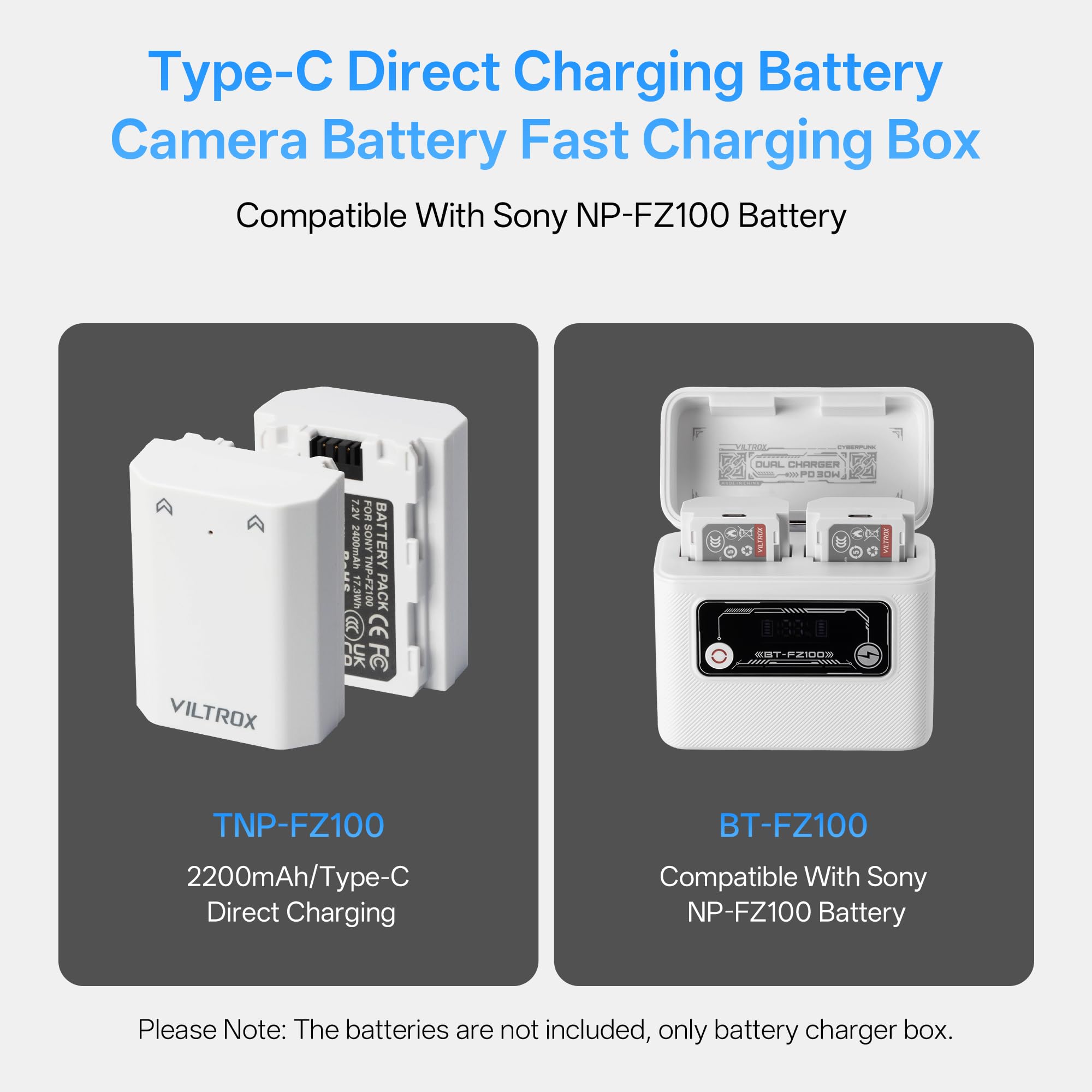 2 Stunden vollständig aufgeladen, sodass Sie unterbrechungsfreie Aufnahmen genießen können. 【Sicher und zuverlässig】 Das VILTROX BT-FZ100 Kamera-Akkuladegerät besteht aus hochwertigen PC-Materialien, um eine gute Haptik und Langlebigkeit zu gewährleisten. Das intelligente LCD-Display zeigt den Akkustatus und den Ladefortschritt in Echtzeit an – so müssen Sie sich beim Fotografieren keine Sorgen mehr um die Stromversorgung machen. 【Erstaunliches Design & breite Kompatibilität】VILTROX Das BT-FZ100 Kamera-Akkuladegerät ist für Sony NP-FZ100 und Viltrox TNP-FZ100 Kamera-Akkus konzipiert. Die Box kann auch als Aufbewahrungsbox für zwei Akkupacks dienen und schützt so vor Stößen, Staub und Schmutz. – ideal für unterwegs und Outdoor-Aufnahmen. Eingebaute Mehrfachschutzfunktionen (Überladung, Kurzschluss, Wiederherstellung, Überstrom, Überentladung, Überspannung, Überlastung, Überhitzung, Schutz vor elektromagnetischen Feldern) sorgen für beruhigende Sicherheit. Sony Akkuladegerät BC-TRW Kamera Ladegerät, mit Kabel | Kaufen auf Ricardo Sony Camera VILTROX NP-FZ100 Kamera-Akku-Ladegerät & Powerbank, 5500 MAh, 30 W, USB Batterie Ladegerät 【30W Dual-Schnellladefunktion】 Integrierter 7,4V/5500mAh Akku und 30W QC/PD 3., 0 Dual-Schnellladetechnologie, 50% schneller als das Original. 【Vielseitiges Dual-Slot-Ladegerät】 Das Dual-Slot-Design ermöglicht das gleichzeitige Laden von zwei NP-FZ100 Akkus. AKKULADEGERÄT FÜR NP-FZ100 | BC-QZ1 | Switzerland Bei leerem Akku ist das Ladegerät in ca. AKKULADEGERÄT FÜR NP-FZ100 | BC-QZ1 | Germany