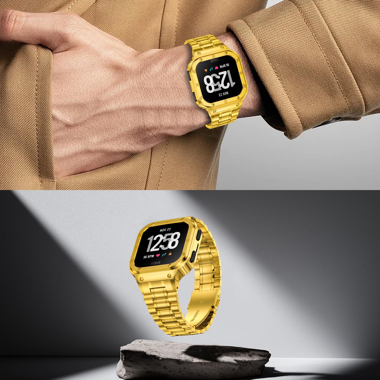 Deczone Edelstahl-Uhrenarmband Mit Fall Kompatibel Für Fitbit Versa 4 3 2 1 Lite, Fitbit Sense 2/Sense Bands, Robuste Schützende Stoßstange Metall- Armbänder Für Männer Frauen