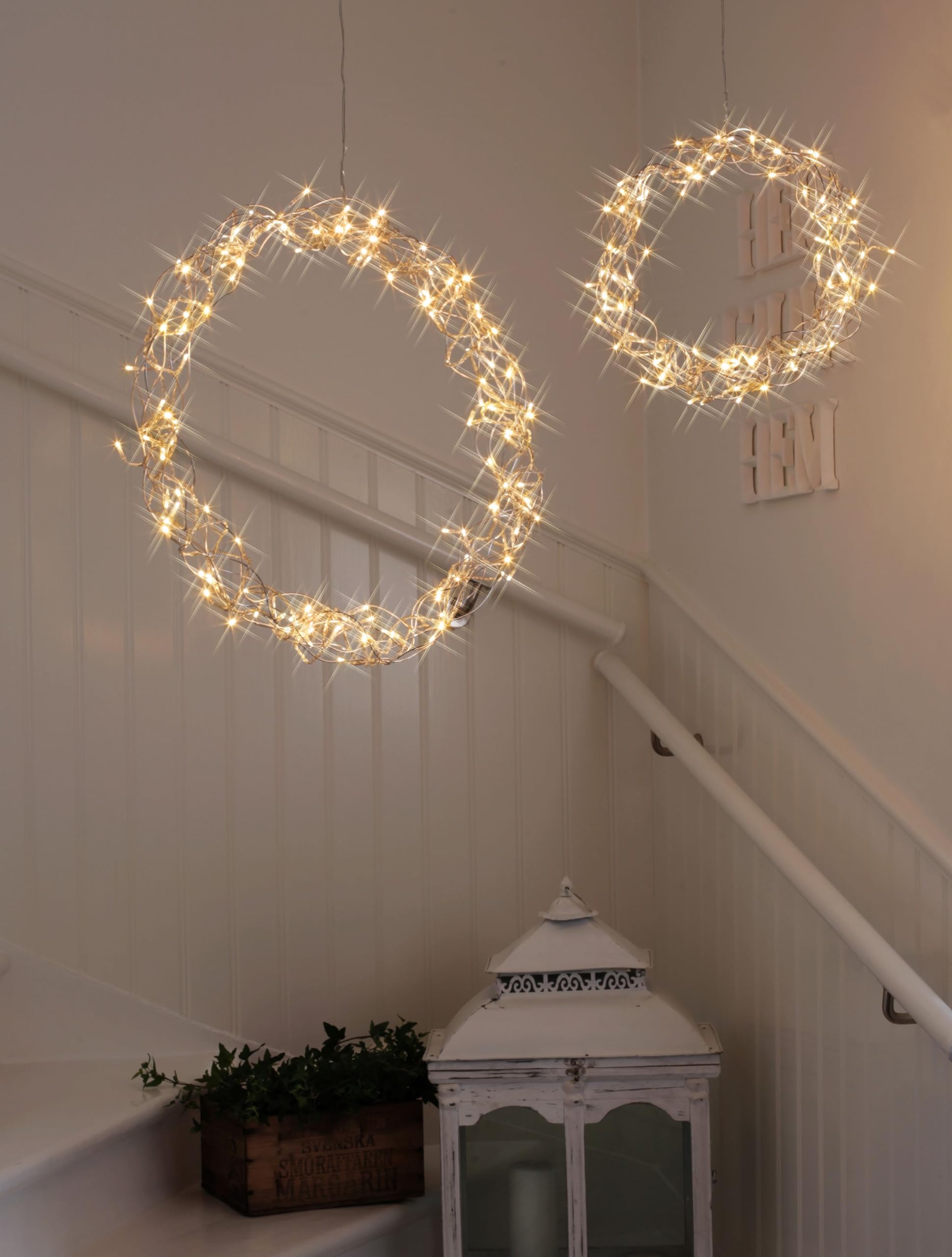 Chromfarbener LED Kranz Curly 45 cm mit 50 warmweißen LEDs – stilvolle Weihnachtsdeko für Fenster, Wand und Tisch im Innenbereich LED-Dekoleuchte "Curly", Metall, 0.06W, 3V,33 lm, warmweiß, 30 LED's, 30x30cm - •0.06W • 3V • Lichtstrom: 33lm • Material: Metall • Farbe: chrom •Lichtfarbe: warmweiß • Farbtemperatur: 2000K •Maße: 30 Insgesamt 50 LEDs beleuchten diese Deko Lampe mit ihrem angenehmen warmweißen Licht. LED Lichterkranz Curly von Star Trading 45 x 45 cm, 50 warmwhite LED, Material: chromfarbenes Metall, transparentes Kabel mit Trafo, Vierfarb-Karton Set enthält: 1x Dekokranz Die kleinen Dew Drop Lichter sind ein echter Hingucker. Deko Ringe zum Aufhängen werden immer beliebter, deshalb sollten Sie sich diese Metallring Deko auf keinen Fall entgehen lassen. Fensterbeleuchtung Weihnachten Lichterkranz Fensterlicht Holz Advent Weihnachtslicht Glocken In Bayern Weihnachtsstern Batterie LED Dekokranz 'Curly', silber, Ø 30cm Weihnachtskränze symbolisieren den Advent und zeigen, dass die besinnlichste Zeit des Jahres ansteht. Die Zuleitung des LED Dekokranz Curly beträgt großzügige 3,50 m, was Dir genügend Flexibilität für Deine festliche Beleuchtung schafft – übrigens nicht nur zur Weihnachtszeit: Sei bereit, Deine Gäste das ganze Jahr über zu jedem Anlass mit diesem dekorativen Metallkranz zu beeindrucken und Deine Dekobeleuchtung auf ein neues Niveau zu heben! Der LED Lichtkranz ist aus hochwertigem Stahl und Kunststoff hergestellt und ist für den Einsatz im Indoor Bereich vorgesehen.