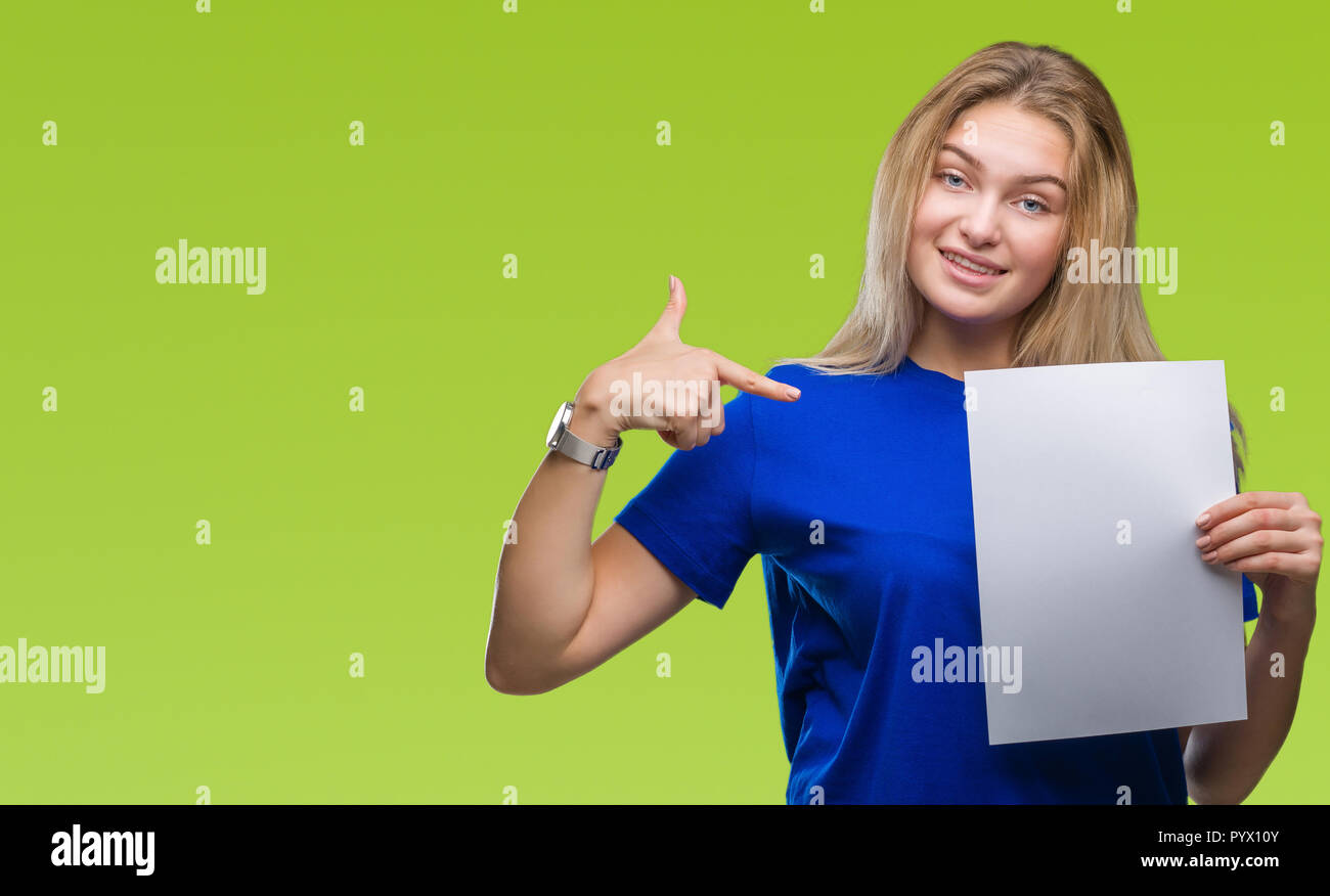Junge Kaukasier Frau Mit Leeren Blatt Papier über Isolierte Hintergrund Mit Uberraschung Gesicht Zeigenden Finger Zu Sich Selbst Image223691691