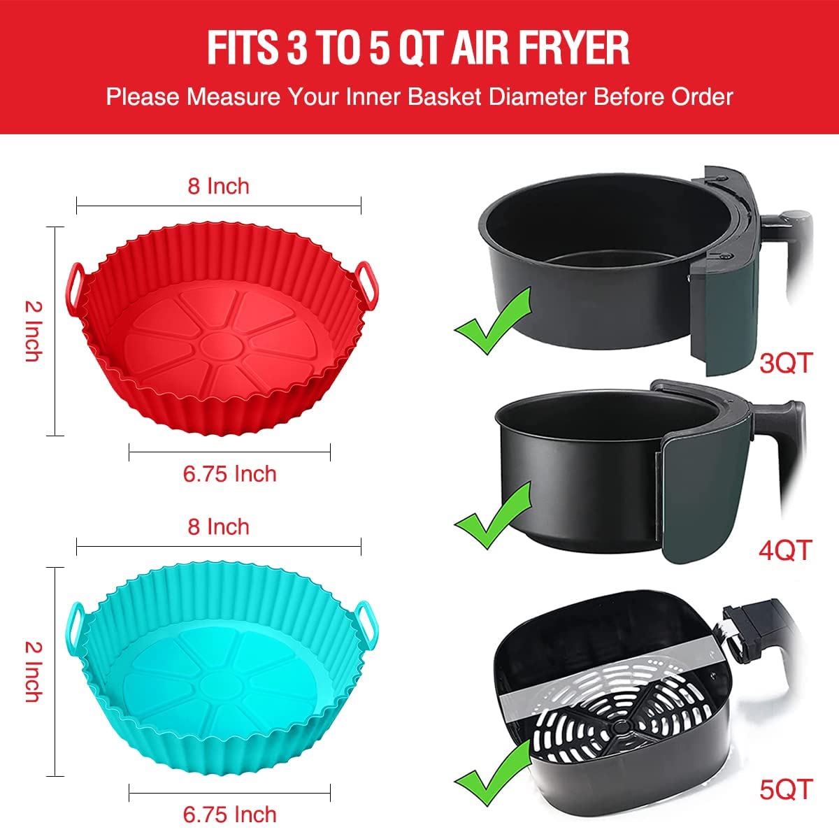 2 Pack Air Fryer Silikon Liners Basket Round Apply to 1 - 3.5 QT Absolut spülmaschinenfest, Sie können es einfach vorher mit heißem Wasser abspülen, dann lassen Sie es in Ihrer Spülmaschine. Geeignet zum Kochen verschiedener köstlicher Speisen: Gemüse, Pommes, Truthahn, Hühnerflügel, Kekse, Eierkuchen, ., ., ., Lebensmittelecht und hitzebeständig: Die runden Silikoneinlagen von BlueStars sind aus lebensmittelechtem verdicktem Silikonmaterial, das BPA-frei, antihaftbeschichtet, öldicht ist und Hitze bis zu 232 °C standhält. EINFACH ZU REINIGEN & WIEDERVERWENDEN - Der 16,5 cm große Silikon-Basistopf kann nach jedem Gebrauch mit seiner Antihaft-Oberfläche leicht gereinigt werden, entweder von Hand oder in der Spülmaschine. Dieser wiederverwendbare Air Fryer Liner bietet eine antihaftbeschichtete und hitzebeständige Kochbasis für Lebensmittel, die Tropfen auffängt und die Reinigung vereinfacht. Es verfügt über zwei Griffe auf beiden Seiten, um einen bequemen, rutschfesten Griff für einfaches Ein- und Ausziehen zu bieten. Im Vergleich zu Einweg-Papier-Pergamenteinlagen (einmaliger Gebrauch) wird diese wiederverwendbare Luftfritteusen-Auskleidung nicht verschwendet, brennbar oder hinterlässt klebrige Speisereste und Ölflecken auf Ihrem Luftfritteusenkorb. Verabschieden Sie sich von klebrigen verbrannten Rückständen und stressigem Schrubben! 3 Packungen Silikonfor für Heißluftfritteuse, Silikonfor... Geschirr Für Heißluftfritteuse Silikon Air Fryer Liner, 20,3 Cm Air Fryer Silikon Topf, Wiederverwendbarer Antihaft-Home Kitchen Air Fryer Basket, Air Fryer Zubehör Für Ofen (Braun Dishwasher Safe Es kann umgedreht werden, um doppelseitig austauschbar für eine längere Nutzungszeit zu verwenden.