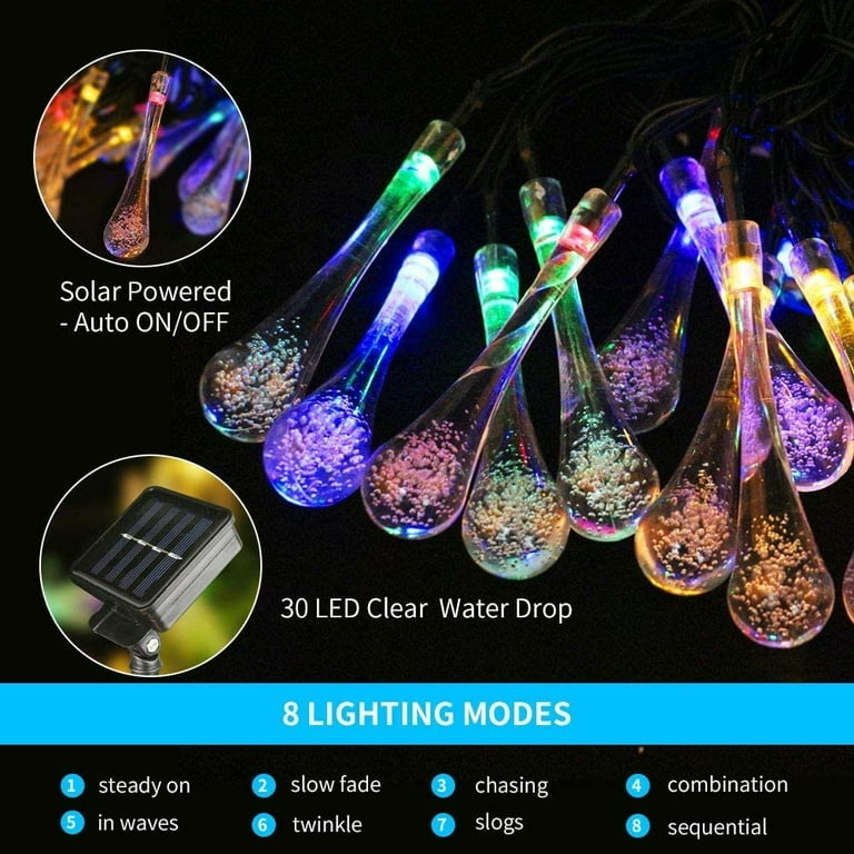 Es besteht keine Gefahr eines Bruchs oder einer Überhitzung. 【Wasserdicht und sicher zu verwenden】Outdoor-Solar-String-Lichter sind wasserdicht, so dass es allen Arten von Wetter, wie Regen, Wind und Schnee standhalten kann. Fügen Sie Vitalität zu Ihrem Leben, eine gute Wahl für die Dekoration Ihres Hofes und Gartens. Diese Acryl-Tränenleuchten sind viel leichter und sicherer als Glasleuchten. 【Wassertropfenförmiges Design】 Dieses Sonnenscheinlicht ist vom natürlichen Element - Wassertropfen - inspiriert, reflektieren diese speziellen Lichter blendende Licht und Farbe. 【Ideale Dekoration】 Wenn Sie Ihren Garten, Terrasse, Dach, Veranda, Zuhause und so weiter schmücken möchten. Es muss an einem sonnigen Tag vollständig aufgeladen werden., 2., Es wird empfohlen, das Solarpanel für 6 Stunden bei der ersten Verwendung vollständig aufzuladen., 3., Das Licht wird automatisch in der Dämmerung aufleuchten und kann automatisch ausgeschaltet werden, wenn das Umgebungslicht zu stark ist (über 15 Lux)., 4., Schalten Sie das Licht ein und stellen Sie den Lichtmodus ein, bevor Sie den Solarstrom laden, damit er in der Dämmerung aufleuchtet. Tropfen Lichterkette EONANT Outdoor Solar Lichterkette, 30LED 20 Fuß Solar Kristallkugel Wasserdichte Lichterketten, Gartenkugel Lichter, Weihnachten, Urlaub, Zuhause, Hochzeit, Partydekoration Beleuchtung (Multicolor Lichterkette Garten YTFR 3er Pack Solar Garten Blumen Lichter im Freien Solar... 【8 Modi, um Ihr Leben zu bereichern】 Die Tränen Tropfen Solar Saiten Lichter haben 8 verschiedene Modi, schalten Sie den blinkenden Modus an und Sie werden sich fühlen, als ob Sie an einer lebhaften Party teilnehmen; während der langsame Leuchtmodus perfekt ist, um sich auf einer ruhigen Terrasse zu entspannen. LED Solar Straße Lichter Bewegung Sensor Lampe Was... – Vicedeal Diese Solar-Saitenleuchten werden Ihre ideale Wahl sein. Ovker Solar Lichterketten für Außen Garten, 50 LED 7m Solar