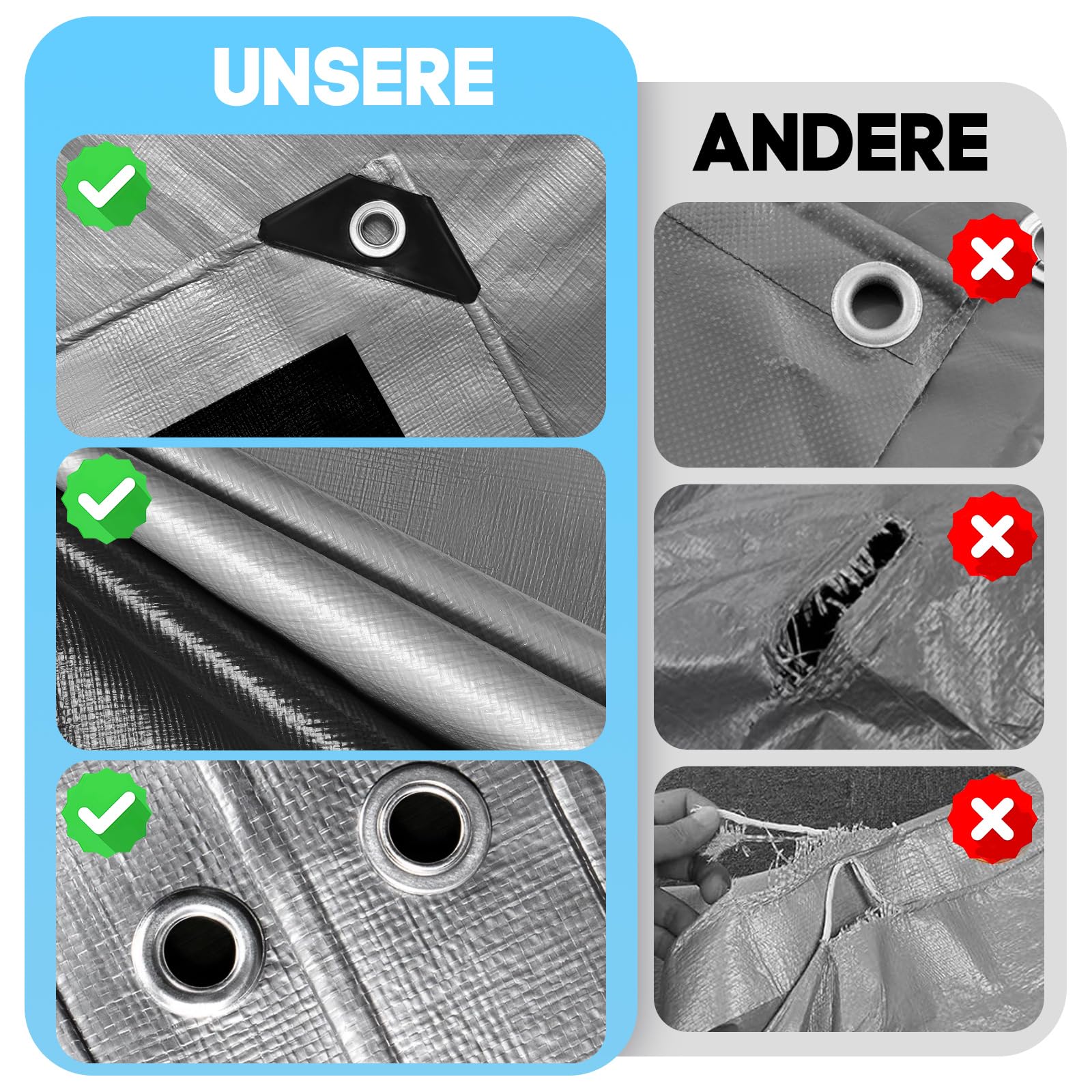 Sie eignet sich perfekt zum Abdecken des Baumaterials oder Geräten bzw. Maschinen auf Baustellen, als Notdach und vielen mehr. Auch zum Schutz vor Wind und Wetter der Gartenmöbel, Brennholz, Fahrräder, Autos, Boote lässt sich die Abdeckplane hervorragend einsetzen Vielseitig und effizient: ideal für Bau, Landwirtschaft, Bootfahren, Camping und mehr. Holen Sie sich Ihre robuste, wasserdichte Plane von HOMESTEAD noch heute Verbesserte Kantenverstärkung: Verstärkter Saum mit PP-Seil, Kunststoffecken und rostfreien Aluminiumösen alle 91 cm. Die HOMESTEAD strapazierfähige, wasserdichte Abdeckplane: Ultimativer Schutz für alle Ihre Outdoor-Bedürfnisse. Doppelschichtiger Schutz: doppelt laminierte Beschichtung für maximale Haltbarkeit. Hergestellt aus hochwertigem 12-mm-Polyethylen und mit rostfreien Ösen. Allzweckplane Gewebeplane 10x10m, Plane Wasserdicht, Abdeckplane Mit Ösen Reißfest, UV-Beständig, Wetterfest Zeltplane, Schutzplane Universal Für LKW, Pool, Holz, Auto, Boot Plane 10x5m Abdeckplane, 270 G/m², Besonders Robuste, Wasserdichte Bodenschutzplane Für Den Bau, Verkleidung Grün Und Silberfarben Plane 6x10m Die Abdeckplane hat eine eingesäumte PP-Schnur, ist beidseitig beschichtet, rundum randverstärkt und mit Metallösen im Abstand von ca. 100 cm versehen. Sie ist lieferbar in den Standard-Farben weiss-transluzent und oliv Starkes und widerstandsfähiges Gewebe – 160 g/m², 10 mm dick, mit extra starkem Gewebe für Langlebigkeit.