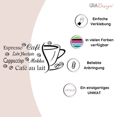 Anleitung, mit Montagefolie, für In- und Outdoor geeignet 29x5 cm (weitere Größen und Farben finden Sie in unserem Sortiment) Wandtattoo Kaffee und Humor Stress Wandaufkleber Küche Zitat Coffee Maße 40 cm hoch x 39,2 cm breit 50 cm hoch x 49,1 cm breit 60 cm hoch x 58,9 cm breit 70 cm hoch x 68,7 cm breit 80 cm hoch x 78,5 cm breit 90 cm hoch x 88,3 cm breit seidenmatte Optik einfarbige, freigestellte Schrift / Motive ohne störende Hintergrundfolie geschnitten aus Oracal Qualitätsfolie sieht nach dem Aufkleben aus wie aufgemalt im Innenbereich nahezu unbegrenzt haltbar komplett verklebefertige Lieferung bei Bedarf rückstandslos wieder zu entfernen speziell für jeden Kunden angefertigte Tattoos Klebeanleitung liegt jeder Lieferung bei Die Abbildungen sind immer Fotomontagen und sind nicht Größenverbindlich. Möchten Sie anschließend einmal umdekorieren, kein Problem! Die Wandaufkleber lassen sich rückstandslos wieder entfernen. Die Sticker sind konturgenau geschnitten. Aufkleber Dekoset in Folienqualität aus der Werbebranche. Verwendung: Wandtattoo, Rauhfaser geeignet, Fenster-& Spiegeldekoration, Badezimmerfliesen, Autoaufkleber , leichte Montage inkl. Wandtattoo Kaffee GRAZDesign Wandtattoo Küche Sprüche | Kochen Mit Herz | Wandsticker Sticker Esszimmer Wanddeko Coffee Wandaufkleber, Küchenrückwand Küchen Deko Wandtattoo Küchen Das Wandtattoo für Deine Küche wird aus einer hochwertigen selbstklebenden Folie gefertigt. Diese Folie ist wasserabweisend und eignet sich somit perfekt für den Gebrauch in der Küche. Die einzigartige Qualität der Folie und die hochwertige, konturgeschnittene Verarbeitung des Wandtattoos versprechen stets, ein einzigartiges und erstklassiges Ergebnis Wandtattoo für die Küche - perfekt für Kaffeegenießer Wandtattoo Coffee Bar - moderner Schriftmix für die Küche - Für den täglichen Kaffee-Genuss Der Wandspruch Coffee Bar lädt Sie zu einer Kaffeepause ein, die Sie sich nicht entgehen lassen sollten Die brillianten Farben verblassen auch nach mehreren Jahren im Außenbereich nicht. Auch ist es untersagt, unsere Motive in Stickdateien ect. Der sonst oft störende Hintergrund ist desshalb nicht vorhanden: die Aufkleber wirken wie aufgemalt.