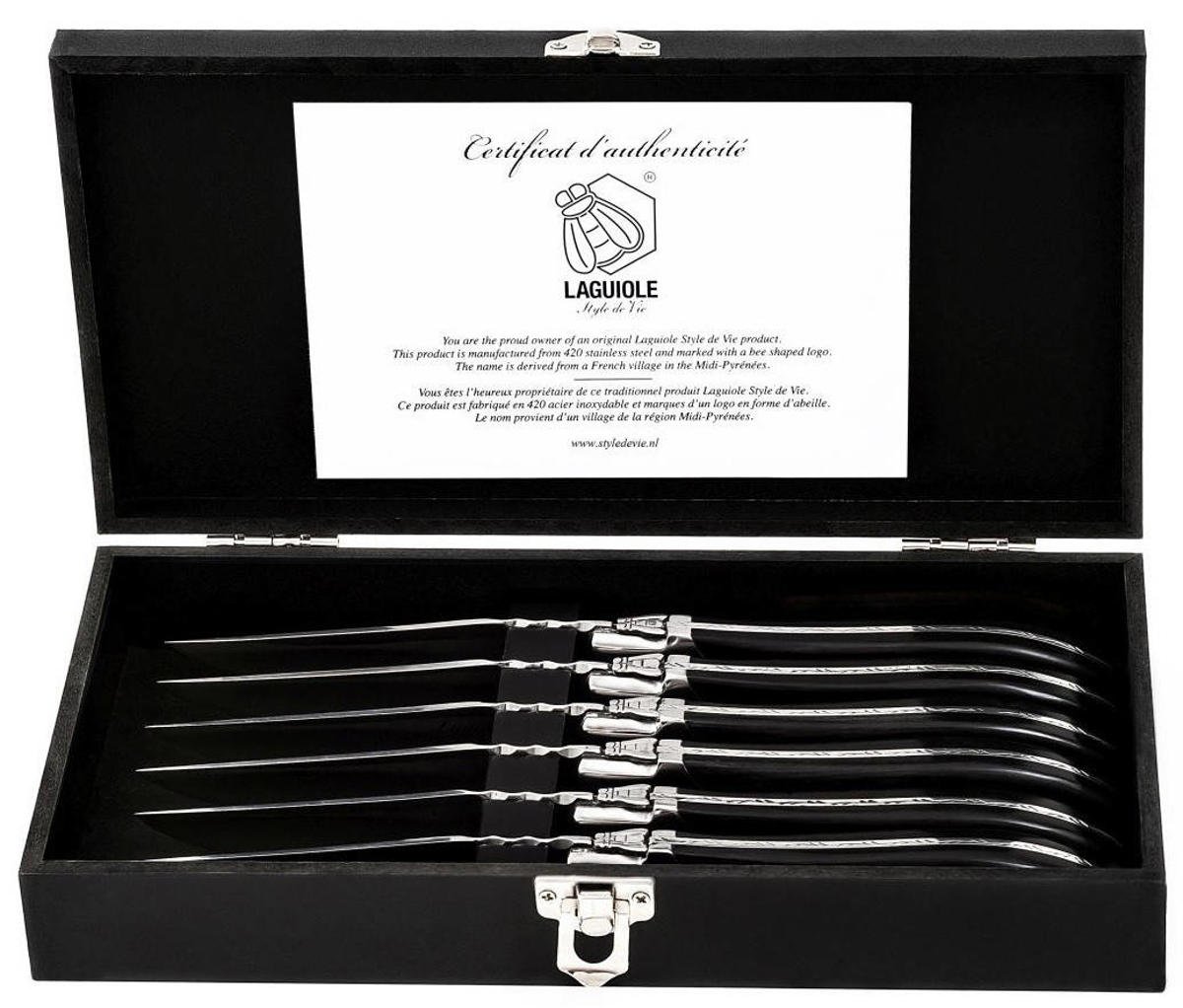 Klinge und Aufbewahrungsblock sind mit der bekannten Laguiole-Honigbiene versehen., Inklusive Holzlagerblock., Spülmaschinenfest., Klingenlänge: 11cm., Dicke: 1,2mm., Gesamtlänge: 23cm. Das Laguiole Style de Vie Premium Line Steak Messerset besteht aus 6 gezackten Steakmessern, die in einem hölzernen Aufbewahrungsblock verpackt sind. Entdecken Sie unsere exklusive Auswahl an Laguiole Messern, die ausschließlich aus Frankreich stammen und nach traditionellen Fertigungsmethoden in den Schmieden von Laguiole und Umgebung gefertigt werden Tevens kan het heft door de hitte gaan barsten. Bestek met een houten heft zal direct zichtbaar beschadigen en een geklonken handvat zal op den duur gaan scheuren op de klinknagels. Laguiole Style de Vie-Produkte werden in China mit sehr hohen Qualitätsstandards hergestellt. Set mit 6 gezackten Steakmessern aus rostfreiem Stahl., Mit holzfarbenen Kunststoffgriffen. Die Steakmesser haben eine 11 cm lange Klinge aus rostfreiem Stahl und eignen sich für verschiedene Fleischsorten. Forge de Laguiole - Laguiole Onlineshop Dies ist ein original Laguiole Style de Vie Produkt und wird mit einem Echtheitszertifikat geliefert. Laguiole Besteck STEAKMESSEN INNOVATION LINE GRIJS GLAD LEMMET ROESTVRIJSTAAL SET Á 6 STUKS LAGUIOLE STYLE DE VIE Steakmesser Laguiole Hierdoor kan de snede beschadigen.