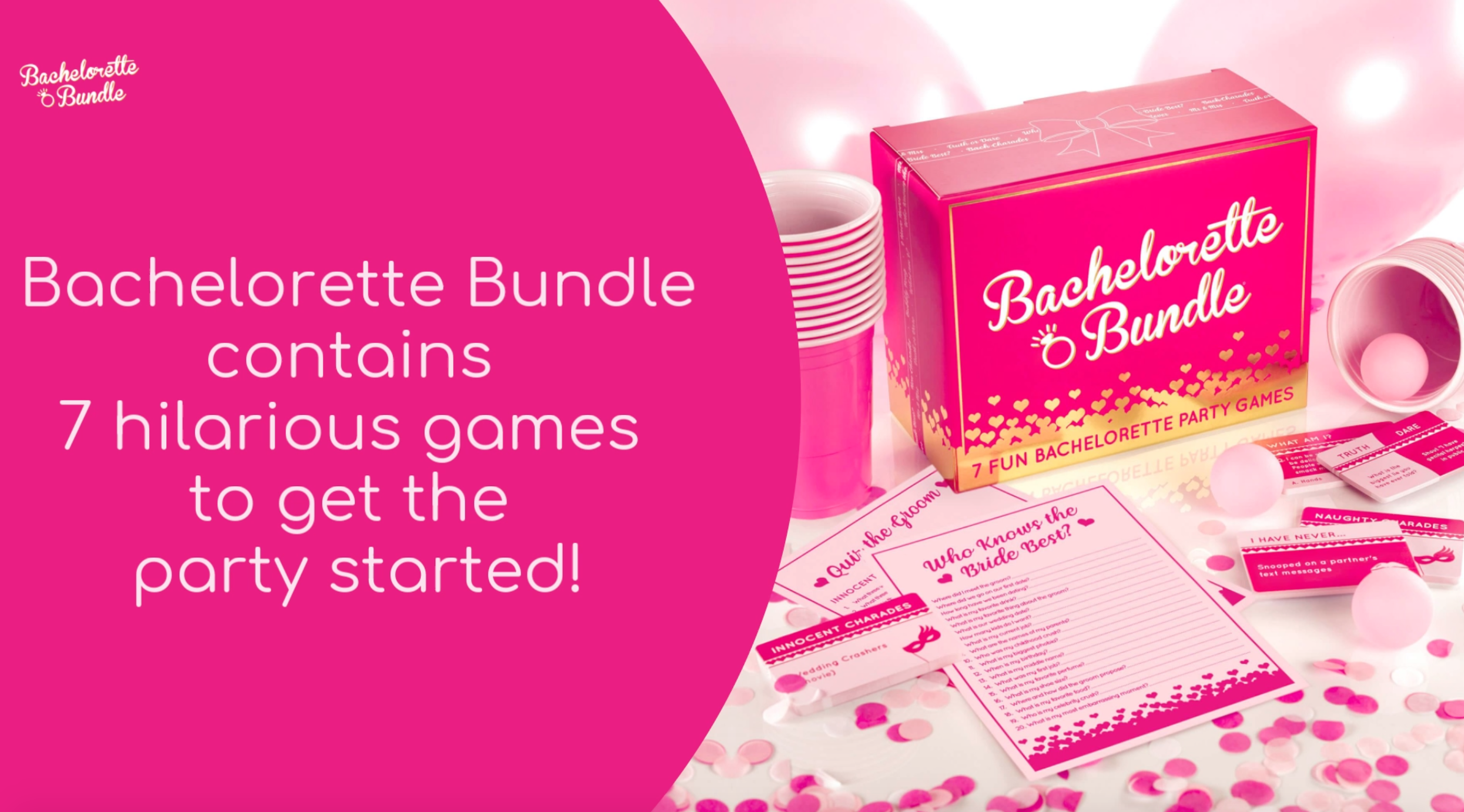 Perfekt für: Bachelorette-Partys aller Größen und Anlässe, einschließlich Ausflüge und Wochenendausflüge. Was ist drinnen: Enthält alles, was Sie brauchen, um Bubbly Pong zu spielen, Quiz the Groom, Bach Charades, I Have Never, Who Knows the Bride Best?, Was bin ich? und Wahrheit oder Dare. Enthält: 20 rosa Pong-Becher und 4 Ping-Pong-Bälle 28 Karten Truth or Dare 28 'Was bin ich?' Karten Wer kennt die Braut best? Quizblatt , Spielregeln OPTIONAL DRINKING RELES: Enthält optionale Trinkspielvarianten, um die Junggesellenabschied in kürzester Zeit in vollem Gange zu haben! 28 unschuldige Bach Charades Karten I Have Never - Dieser freche Eisbrecher wird die Party in den Ringen von Kichern haben Komplettes Party-Paket: Bachelorette Bundle ist die ultimative Sammlung von Junggesellenabschieden mit absolut allem, was Sie brauchen, um eine lustige und unvergessliche Junggesellenabschied für die Braut zu beherbergen Seine Handtaschengröße bedeutet, dass es tragbar genug ist für eine Nacht in der Stadt oder eine Freundin Wochenendreise ist. 56 I Have Never Karten Lieferumfang: Bubbly Pong - Pop the Prosecco und lass dich mit diesem klassischen Boozy Party Starter Bachelorette Bundle - 7 lustige Bachelorette Party Games Dieses All-in-One-Paket sorgt dafür, dass Ihre Junggesellinnenabschiede Party Unterhaltung erledigt wird. 28 naughty Bach Charades Karten Unschuldiges Quiz the Groom Quiz Sheet Truth or Dare – Würzen Sie garantiert die Nacht auf und drehen Sie ein paar Gesichter. Inklusive optionaler Trinkspielregeln, um die sprudelnde Luft fließen zu lassen. Fun Bachelorette Party Games That Everyone Will Love (2025 Truth Or Drink Fun Bachelorette Party Games That The Whole Group Will Love - Styl Inc Who Am I Geeignet für Partys von 3 bis 30 Jahren. Einfach Freunde hinzufügen und sprudeln.