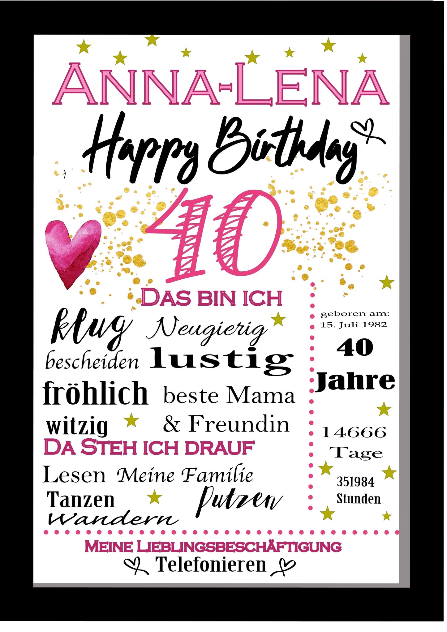 Ideales Geburtstagsgeschenk für Frauen zum 40., Geburtstag: Unser Edelstahlbecher ist die beste Wahl für Ihr Geschenk zum 40., Geburtstag für Frauen, egal ob es an Ihre Mutter, Ehefrau, Schwester oder Freundin gegeben wird, er ist ein praktisches und schönes Geschenk. Das Material bietet auch eine hervorragende Isolierung, hält Getränke über längere Zeit heiß oder kalt. 【Hochwertiges Material】Hergestellt aus hochwertigem Edelstahl, ist dieser Becher für die Ewigkeit gebaut. Unsere Edelstahl-Wasserflasche ist das perfekte Geschenk für eine bemerkenswerte Frau, die ihren Geburtstag feiert. Es ist resistent gegen Rost und Korrosion und sorgt für Langlebigkeit für den täglichen Gebrauch. Mit einem stilvollen Finish und einem auslaufsicheren Deckel vereint er Funktionalität und Eleganz. Leicht zu reinigen und zu transportieren: Die breite Öffnung des Bechers erleichtert die Reinigung und ermöglicht ein gründliches Waschen, um ihn hygienisch zu halten. Geschenk zum 40. Geburtstag für Frauen, 400 ml, rosa fabelhafte Keramik-Kaffeetasse Google Übersetzung von 'Geschenk' ansehen. In anderen Sprachen: Spanisch | Französisch | Portugiesisch | Italienisch | Niederländisch | Schwedisch | Polnisch | Rumänisch | Tschechisch | Griechisch | Türkisch | Chinesisch | Japanisch | Koreanisch | Arabisch Diese elegante und langlebige Flasche ist aus hochwertigem Edelstahl gefertigt, um sicherzustellen, dass sie dem Test der Zeit und des täglichen Gebrauchs standhält. Der sanfte Farbübergang auf dem Becher macht ihn zu einem optisch ansprechenden Accessoire, und das dekorative Muster von Alter und Jahr macht ihn zu einem einzigartigen Geburtstagsgeschenk für sie. Dieser Becher hat ein Fassungsvermögen von 590 ml und passt problemlos in eine Sporttasche oder einen Auto-Becherhalter. Es ist nicht nur eine Wasserflasche, sondern ein praktisches und durchdachtes Geschenk, das sie bei jedem Abenteuer und täglichen Bemühungen begleitet und Ihrem Alltag einen Hauch von Luxus verleiht. 40 Geburtstag Frauen Geschenk Geschenk 40 Geburtstag Frauen - en Kompakter M Geschenk Zum 40 Geburtstag Frau