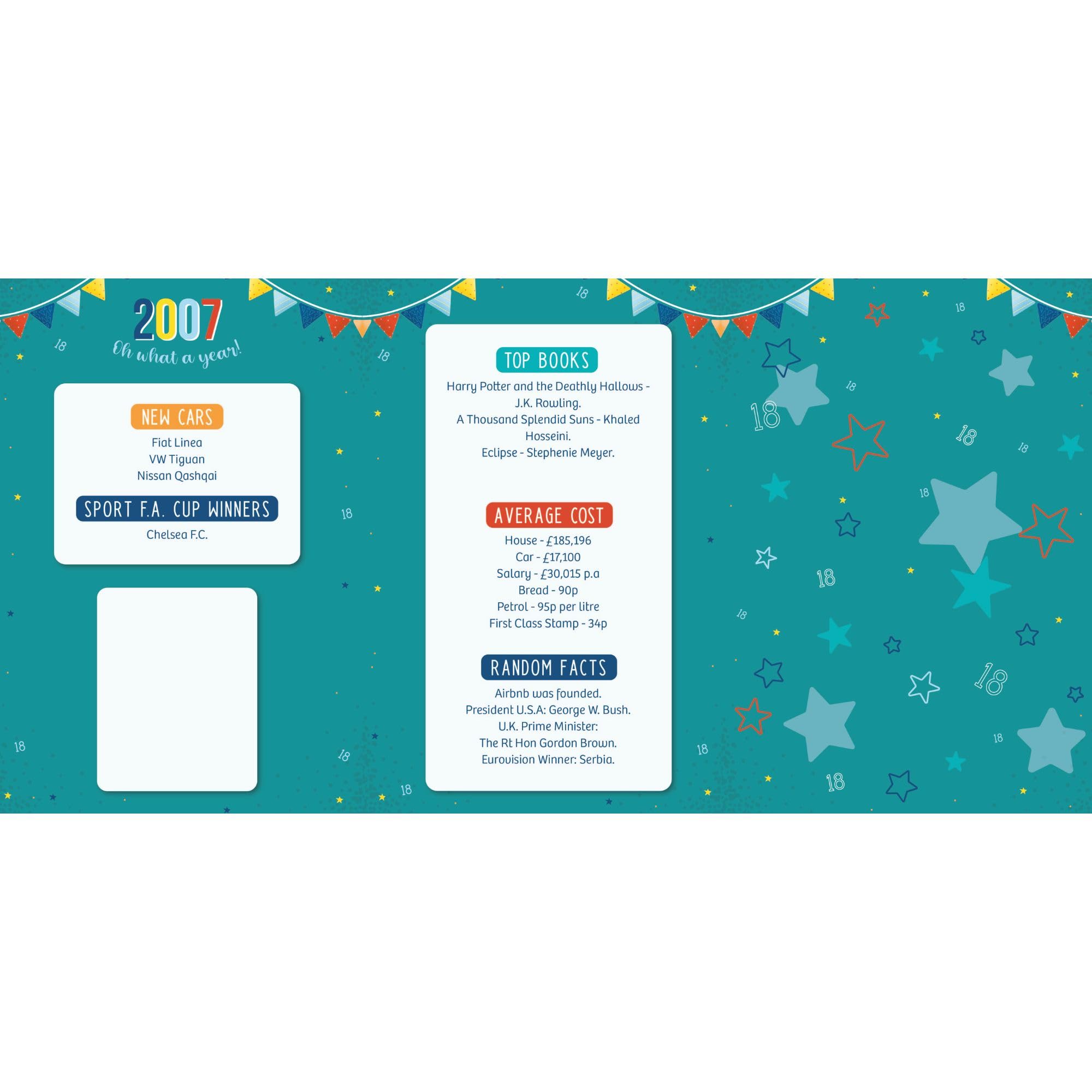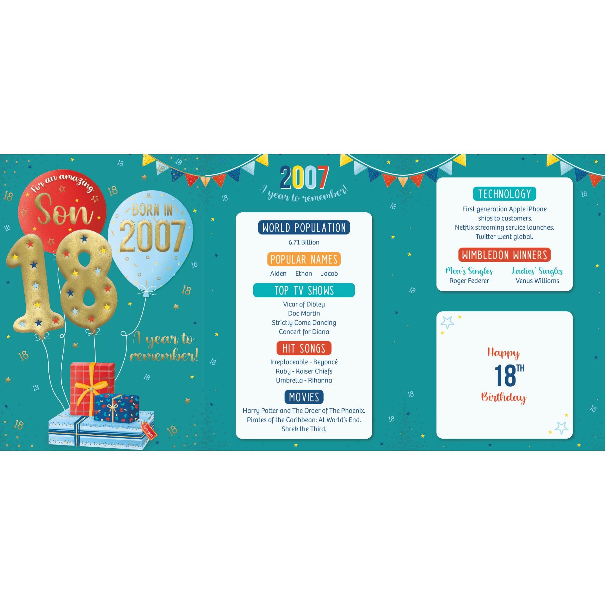 15. Happy Birthday zum 18.! Die Welt wartet auf deine Ideen und Talente – geh hinaus und zeige, was in dir steckt! Mehr Geburtstagswünsche Unvergessliche Geburtstagswnsche zum 40. fr den Mann: Kreative Ideen fr ein besonderes Jubilum! Besondere Geburtstagswnsche fr Fleiige: Feiere die Anstrengung und Hingabe Umweltfreundliche Materialien: Die Karte ist vollständig recycelbar, aus nachhaltigen Materialien hergestellt und verwendet Papier und Tinte aus verantwortungsvoll bewirtschafteten Quellen. Einzigartige Geburtstagskarten: Diese charmante Geburtstagskarte verfügt über ein farbenfrohes Design aus Luftballons und Geschenken, mit der Botschaft For an amazing Son - Born in 2007 - 18 - A year to remember! KARTENABMESSUNGEN - Die IC&G Geburtstagskarte misst 155 x 228 mm und enthält einen passenden Umschlag. Mit einer Vielzahl von Designs bringen diese Karten Spaß und passen zu jeder Persönlichkeit oder jedem Stil. Mit geprägten, metallischen Foliendetails, wodurch es der perfekte Weg ist, um jeden großen Tag stilvoll zu feiern. Mit viel Platz im Inneren für Ihre persönliche Nachricht können Sie Ihre Geburtstagswünsche wirklich einzigartig machen. Seutgjie Banner Happy Birthday 18 Jahre 2007-2025, Dekoration zum 18. Geburtstag, Kulisse für Männer/Frauen, Banner Happy Birthday für Party, Schwarz, 180 x 110 cm Sonja Sohn Lebenslauf Gutschein Zum 18.Geburtstag Verpacken,18 Geburtstag Jungs ,personalisierter Gutschein,geldgeschenk Geburtstag,glückwunsch Zum 18 Geburtstag Sonja Sohn Wife Entdecke ICG Geburtstagskarte zum 18. Geburtstag 2025 – Happy Birthday Year You Were Born in großer Auswahl Vergleichen Angebote und Preise Online kaufen bei Kostenlose Lieferung für viele Artikel Innentext: Jede Karte hat ein lebendiges, vollfarbig illustriertes Design mit interessanten Fakten und Zahlen aus dem Jahr 2007., Bitte sehen Sie sich das zweite und dritte Bild an, um die Innenseite der Karte zu sehen.