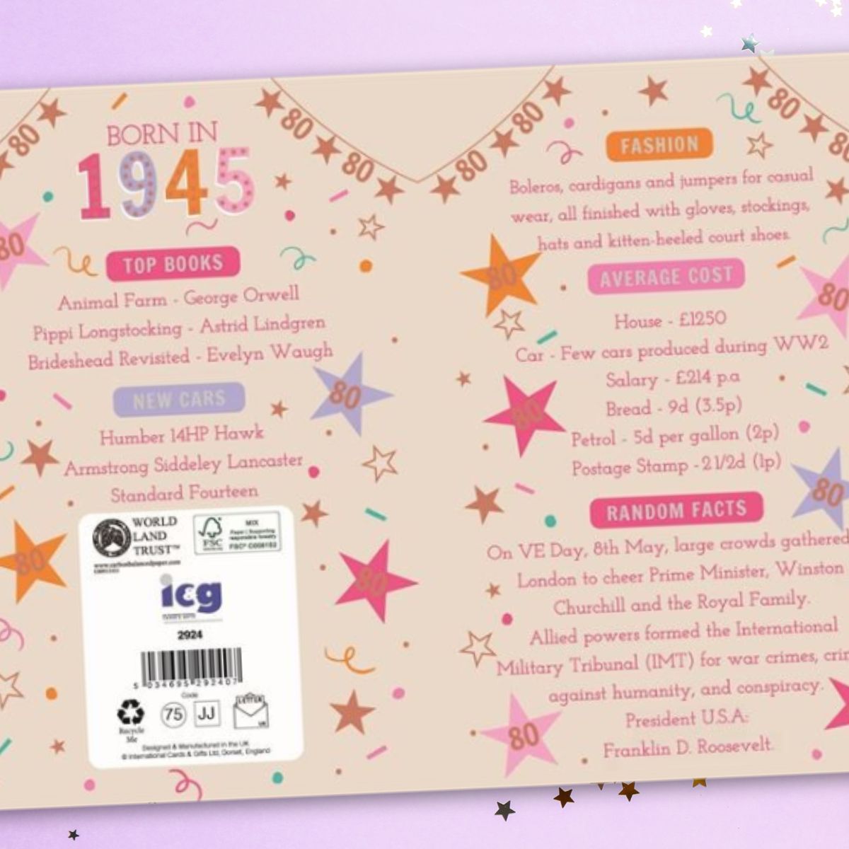 Umweltfreundliche Materialien: Die Karte ist vollständig recycelbar, aus nachhaltigen Materialien hergestellt und verwendet Papier und Tinte aus verantwortungsvoll bewirtschafteten Quellen. Internationale Karten und Geschenke: Ein britisches Premium-Kartenunternehmen, das für die Gestaltung und Erstellung innovativer und attraktiver Designs bekannt ist, auf hochwertigem Karton, mit einem hervorragenden Standard. Beginnen Sie die Party mit den fantastischen Geburtstagskarten von IC&G, perfekt, um jedem besonderen Tag ein Lächeln ins Gesicht zu zaubern. Hergestellt aus hochwertigem FSC-Karton, fühlt sich jede Karte so toll an, wie sie aussieht. Seine praktische Größe ist ideal für den Versand und erfüllt die britischen Briefbeschränkungen. Innentext: Jede Karte hat ein lebendiges, farbenfrohes illustriertes Design mit interessanten Fakten und Zahlen aus dem Jahr 1945., Bitte sehen Sie sich das zweite und dritte Bild an, um die Innenseite der Karte zu sehen. Einzigartige Geburtstagskarten: Diese charmante Geburtstagskarte verfügt über ein modernes Design eines Geschenks mit Konfetti und Sternen, mit der Botschaft "Born in 1945 - 80 - What a year Karten Zum 80 Geburtstag Kostenlos ICG Geburtstagskarte Zum 80. Geburtstag 2025 - Happy Birthday Year You Geschenk Zum 80 Geburtstag Frau Einzigartige Geburtstagskarten: Diese charmante Geburtstagskarte verfügt über ein modernes Design eines Geschenks mit Konfetti und Sternen, mit der Botschaft Born in 1945 - 80 - What a year! PDF - Geldgeschenk Geschenk zum 80 Geburtstag Wunscherfüller