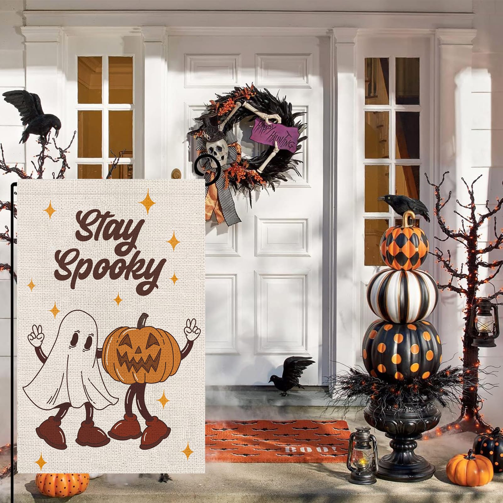 Happy Halloween Gartenflagge Geist Und Jack-O-Lantern Muster, Jute, Vertikal, Doppelseitig, 31,8 X 45,7 Cm, Outdoor-Hof, Haus, Halloween-Dekoration