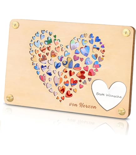 Geldgeschenke Aus Holz Herzig Ukaeno Geldgeschenke Geburtstag, Kreative Geldgeschenk Verpackung, Lustige Geld Wunscherfüller Geldgeschenk 【KREATIVES DESIGN】 Diese Geldgeschenk Verpackung aus hochwertigem Lindenholz kombiniert einzigartiges Design mit Funktionalität. Sie vereint eine wunderschöne Gestaltung mit einer praktischen Geldgeschenk Verpackung und eignet sich als Geburtstagsgeschenk für Geburtstagskinder jeden Alters. Sollten sich Fragen ergeben, stehe ich Dir jederzeit gerne zur Verfügung. 【HOCHWERTIGES MATERIAL】 Gefertigt aus langlebigem Lindenholz, das nicht nur robust, sondern auch umweltfreundlich ist. ♡ WICHTIG ♡ Die Geldscheine dienen lediglich zur Veranschaulichung und werden nicht mit verkauft. Vielseitig: Ideal für Geburtstagsfeiern, Hochzeiten oder andere besondere Anlässe. Postkarte aus Holz / Grußkarte / Holzkarte / Geldgeschenk / Geburtstagskarte / Geschenkidee zum Nachhaltig: Hergestellt aus robustem Holz, ist diese Karte eine umweltfreundliche Alternative zu herkömmlichen Papierkarten. Mit unserer Holzkarte zum Geburtstag zeigst du, wie viel dir das Geburtstagskind bedeutet. Bei Oh!Thanks findest du eine breite Auswahl an einzigartigen Geschenkideen, die von kreativen Designern handverlesen wurden. Viele unserer Produkte sind personalisierbar, sodass du ein Geschenk auswählen kannst, das perfekt zu der Person und dem Anlass passt Eine kreative Verpackung für Geldgeschenke, die das Überreichen von Geldscheinen zu einem besonderen Moment macht. PRODUKT PARAMETER Stärke:Stabil und langlebig, aus hochwertigem Lindenholz gefertigt. Hochwertiges Material: Gefertigt aus robustem Lindenholz, das für seine Langlebigkeit und Umweltfreundlichkeit bekannt ist. Personalisiert: Die Holzoberfläche bietet Platz für persönliche Wünsche oder Nachrichten, um das Geschenk noch individueller zu gestalten. Menge:1 Stück – eine Geldgeschenkverpackung. Perfekte Größe: Die 20,5 x 15 cm große Verpackung eignet sich ideal für Geldscheine oder Gutscheine. PRODUKTGRÖßE:20,5 x 15 cm PACKLISTE:1 x Holz-Geldgeschenkverpackung PRODUKTMERKMALE: Kreatives Design: Mit lustigen Mustern wie Maus, Taube und Weltkarte bietet diese Verpackung eine originelle und einprägsame Art, Geldgeschenke zu verpacken. Du kannst mich jederzeit anschreiben, um diese zu klären. Stil:Kreativ und originell – mit dekorativen Mustern von “Maus, Taube und Weltkarte”. 【VIELSEITIG EINSETZBAR】 Ideal für alle besonderen Anlässe wie Geburtstagsfeiern, Hochzeiten, Konfirmationen oder als Geschenk für Reisende. Bestelle jetzt und verschenke ein unvergessliches Geldgeschenk zum Geburtstag, das von Herzen kommt! Grußkarte Geldgeschenk aus Holz zur Hochzeit mit Trockenblumen Diese Geldgeschenk Verpackung ist leicht und handlich, aber dennoch stabil und widerstandsfähig.