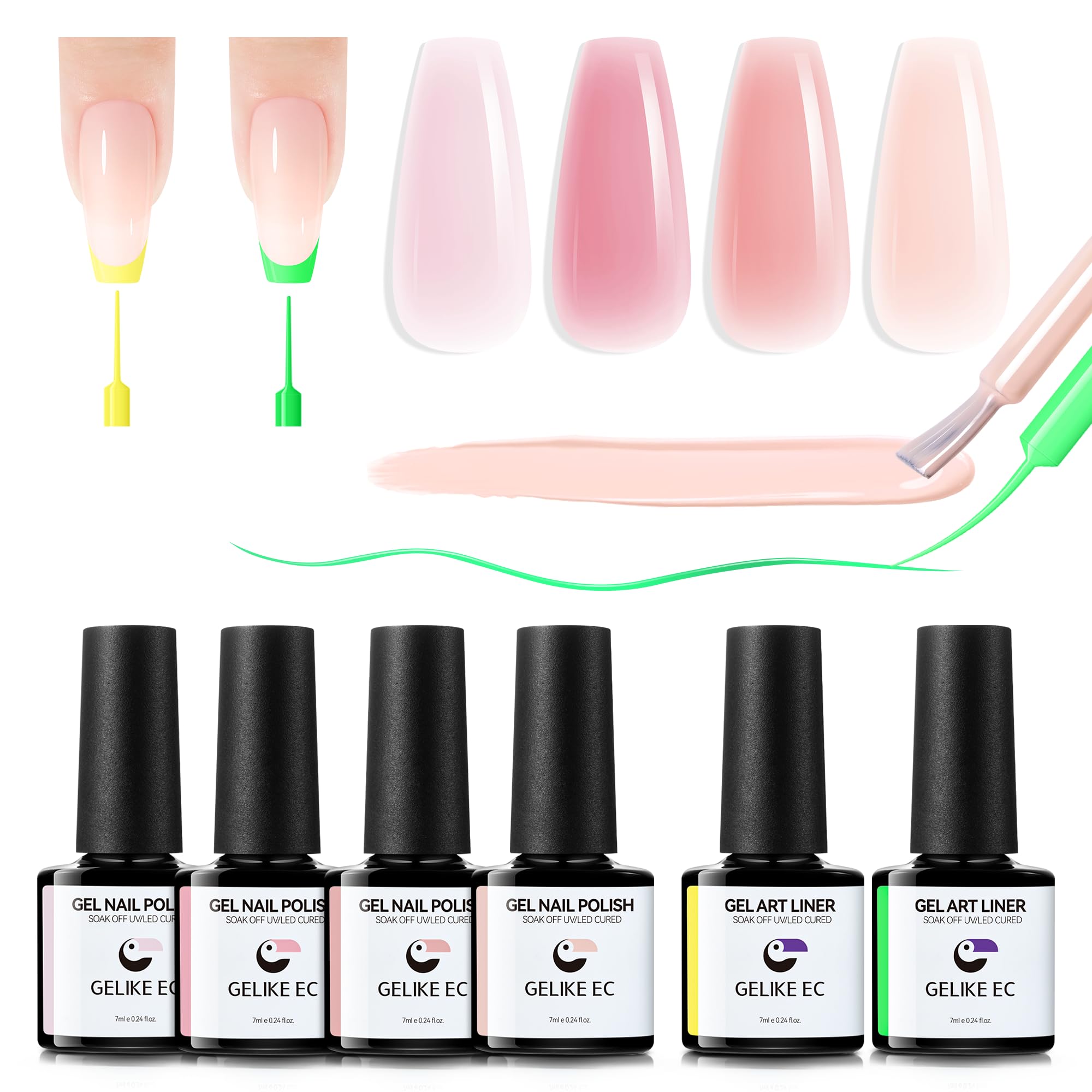 Gelike Ec Sheer Nude Nagellack – Jelly Light Pink Nagellack Mit Yellow Green Gel Liner Set Jelly GelPolish Soak Off UV Für Nail Art French Maniküre Zu Hause 7 Ml 6 Stück