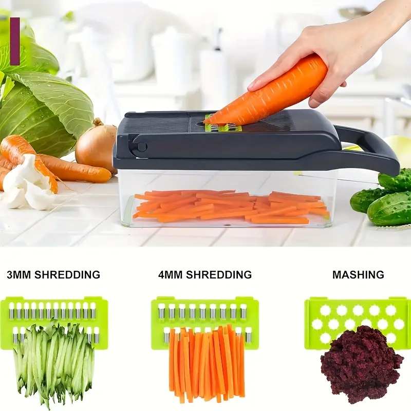 Alle Klingen des vielseitigen Gemüsehackers sind aus rostfreiem Stahl gefertigt und ultrascha Ultrascharfe, gehärtete Edelstahlscheiben zum Zerkleinern / Würfeln der härtesten Gemüse / Käse mit jeweils 1 einfachen Bewegung. Ohne sich um Störungen in der Küche sorgen zu müssen Hinweis: Berühren Sie die Klinge nicht mit der Hand, da es leicht ist, Ihre Finger zu zerkratzen. Praktisches Design: Dieser Gemüseschneider bietet einen 1,5-Liter-Behälter für Obst oder Gemüse. Dadurch wird die Reinigung einzelner Teile wie Auffangbehälter, Messereinsatz aus Edelstahl, Deckel und Hobelaufsatz erleichtert. Produktmaße: 34 x 12,5 x 12 cm Klingenmaterial: Edelstahl Produktgewicht: 800 g. Das rutschfeste Silikon auf der Unterseite bietet hohe Stabilität auf der Arbeitsfläche. Der Spiralgemüseschneider mit der perfekten Schneidefunktion zum einfachen und perfekten Schneiden von Lebensmitteln wie Tomaten, Zwiebeln, Kartoffeln, Mozzarella, hartgekochten Eiern, Pilzen, Karotten, Gurken, Kürbis, Zucchini, uvm. Ailgely 4-in-1 Handheld Gemüseschneider, Elektro-Lebensmittelhacker, USB Kabelloses Mandoline Gemüsehobel 4 In 1 Handheld Gemüseschneider Elektrisch, Multifunktions Gemüsezerkleinerer Mini Lebensmittel Nicer Dicer Chef 16-in-1 Gemüseschneider-Set mit Behälter - Multifunktionaler Küchenhobel, Zerkleinerer, Würfelschneider für Zwiebeln, Kartoffeln, Gurken, Karotten - Klingen aus rostfreiem , Gemüseschneider aus Kunststoff und Obstverarbeiter, Küchengeräte und Werkzeuge Leicht zu reinigen: Der Gemüseschneider kann leicht zerlegt werden.