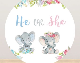 OERJU 5x5ft Elephant Gender Revealed Round Backdrop Pink Or Blue Boy Or Girl Photography Background He Or She What Will Baby Be Floral Newborn Baby Shower Party Decoration