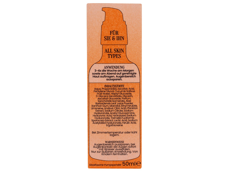 Vitamin C und Hyaluronsäure Gesichtsserum von Covex – 50 ml ist eine wesentliche Ergänzung jeder Hautpflegeroutine, die darauf abzielt, die Hautstrahlung und -feuchtigkeit zu verbessern Die Formel ist mit Vitamin C, Hyaluronsäure und Ellagsäure angereichert, die antioxidative Effekte bieten und gemeinsam die Festigkeit, Elastizität und Hydratation der Haut verbessern.Diese Inhaltsstoffe wurden VITAMIN E ist für seine antioxidative und pflegende Wirkung bekannt. Die Formulierung mit VITAMIN C* und VITAMIN E mildert Hyperpigmentierung und wirkt hauttonausgleichend. Die Serum-Creme spendet Feuchtigkeit und sorgt für ein ebenmäßiges Hautgefühl. LSF 30 und UVA-SCHUTZ bieten einen erhöhten Schutz vor vorzeitiger lichtbedingter... Vitamin C zur Gesichtsaufhellung Gesichtsserum Hyaluronsäure Dunkle Vitamin C Serum Deutsch Gesichtsserum Mit Vitamin C - Bioaqua Vitamine C Face Essence Hyaluron Serum