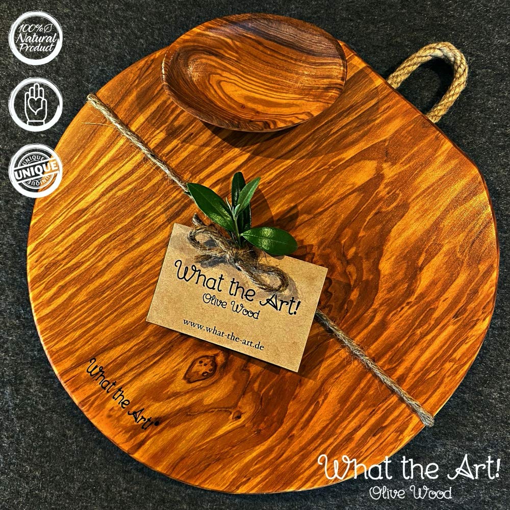 What The Art!® Olive Wood «Soleil» Gr. L | Olivenholz Schneidebrett Inkl. Dip-Schälchen | Handarbeit | 25 X 25 X 2 Cm | Käsebrett - Hackbrett - Tranchierbrett - Servierbrett