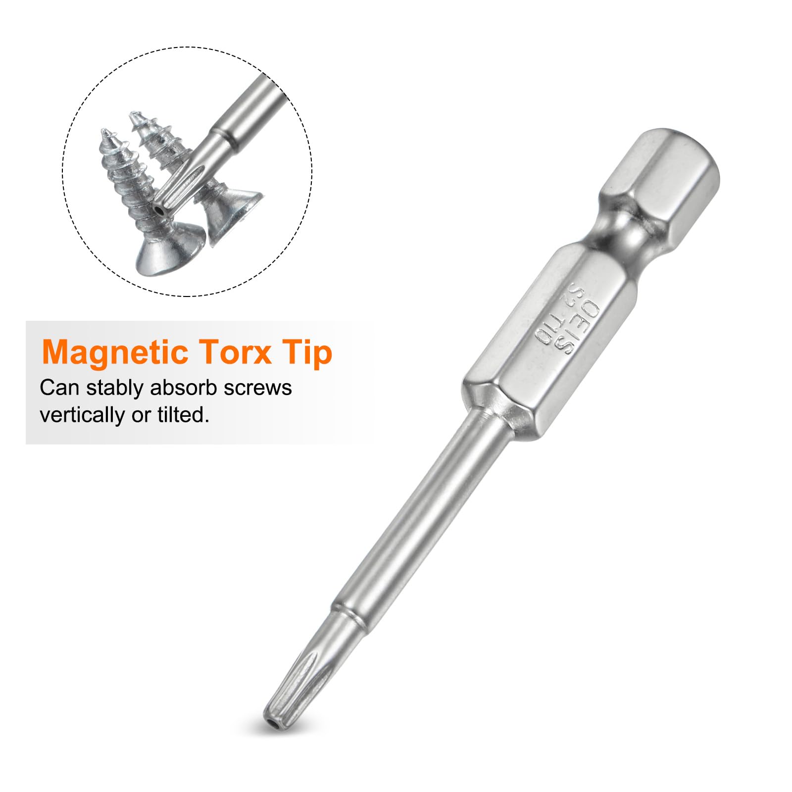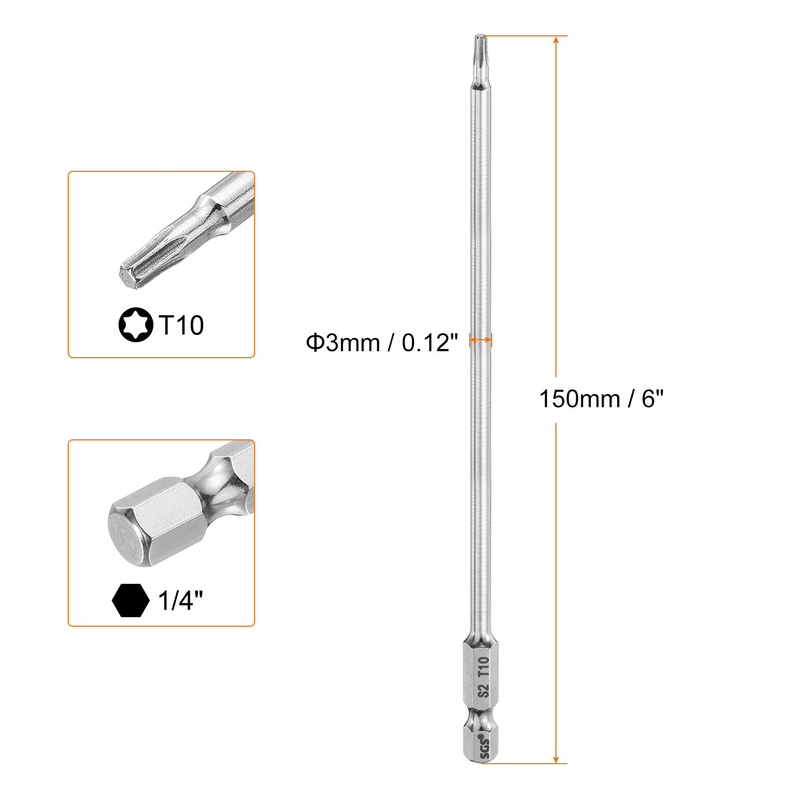 Merkmal - Der Schraubendreher-Bit nimmt ein starkes Magnetismus-Design an und kann Schrauben vertikal oder gekippt aufnehmen. Der Kopf ist eine sechseckige Pflaumenblütenform, die engen Kontakt mit der Schraube herstellen kann, wodurch die Demontage und Installation stabiler und weniger wahrscheinlich zu rutschen ist., 3., Die Oberfläche ist fein poliert, glänzend und glatt, reduziert den Reibungswiderstand, verbessert die Härte und Verschleißfestigkeit und hat eine bessere Kratzfestigkeit. Hinweis - Weit verbreitet in manuellen elektrischen Schraubendrehern, Bohrmaschinen und elektrischen Bohrmaschinen. Material Der 6 Punkt Schraubendreher Torx Bohrer besteht aus wärmebehandeltem S2 Stahl mit einer Härte von bis zu HRC58 60, ausgezeichnete Korrosionsbeständigkeit und Rostbeständigkeit, besser als gewöhnliche Sandstrahlprodukte, biegefest, bruchsicher, nicht leicht zu verformen, und langlebig Panorama24 Torx Bit T10, Menge 1 Stück | Alle Größen - T10 T15 T20 T25 30 T40 - Bitsatz TX Bit Set Schraubendreher Stahl S2 Größe – Stern-Torx-Bit-Größe:T10, Sechskantschaftgröße:1/4 Zoll, Gesamtlänge 150 mm / 6 Zoll, Stabdurchmesser : 4 mm / 0,16 Zoll, Härte: HRC58-60, Stil: Torx-Kopf mit Loch Jeder Sechskant-Schraubendreher-Bit ist zur einfachen Identifizierung deutlich mit Größennummer graviert. Die Oberfläche ist fein poliert, glänzend und glatt, reduziert den Reibungswiderstand, verbessert die Härte und Verschleißfestigkeit und hat eine bessere Kratzfestigkeit. Jeder manipulationssichere Schraubendreherkopf ist zur einfachen Identifizierung deutlich mit der Modellnummer graviert., 4., Magnetischer Stern-Bitkopf hat ein höheres Drehmoment und ist magnetisch, wodurch es einfacher ist, Schrauben auf kleinem Raum zu entfernen und zu installieren. Der Kopf ist eine sechseckige Pflaumenblütenform, die engen Kontakt mit der Schraube herstellen kann, wodurch die Demontage und Installation stabiler und weniger wahrscheinlich zu rutschen ist. Halten Sie es bei der Lagerung von Umgebungen mit hoher magnetischer und hoher Temperatur fern, um den magnetischen Effekt nicht zu beeinträchtigen. Überprüfen Sie vor dem Gebrauch, ob es fest am Elektrowerkzeug installiert ist. HARFINGTON T10 Torx-Schraubendreher-Bits, 6,35 Mm Sechskantschaft, 25
