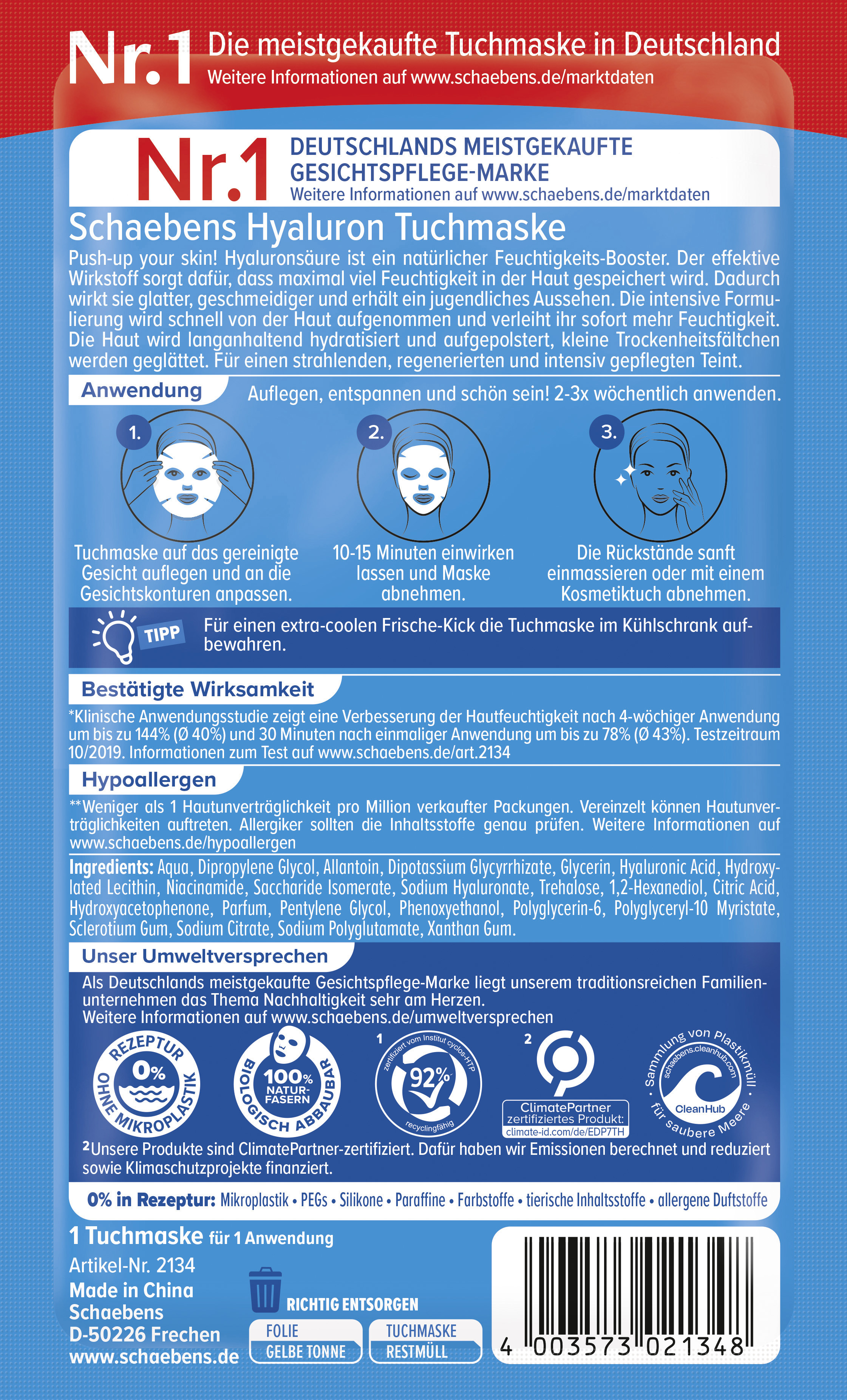 Die Schaebens Men Intense Repair Tuchmaske spendet bis zu 68 % mehr Feuchtigkeit. Produktbeschreibung Die erfrischende MEN Intense Repair Tuchmaske besänftigt strapazierte Haut und pflegt sie intensiv ohne zu fetten. Hyaluron Tuchmaske 3 Gesichtsmasken mit Hyaluronsäure & Allantoin sofort Effekt Schaebens Intense Repair Tuchmaske Men bei MÜLLER Versandkostenfrei in die Filiale › Jetzt bestellen Koffein Haarmaske Werbung * FÜR DIE HERREN HABE ICH AUCH MAL WAS 😀 @schaebens MEN Intense Repair Tuchmaske Sie Erfrischt Nach Dem Rasieren Und Beruhigt Die Angekratzte Haut. Und Dabei Schenkt Sie Bis Zu Schaebens Augenpads Gebrauchsanweisung Auflegen, entspannen und erfrischt sein! 2-3x wöchentlich anwenden., 1., Tuchmaske auf das gereinigte Gesicht auflegen und an die Gesichtskonturen anpassen., 2., 10-15 Minuten einwirken lassen und Maske abnehmen., 3., Die Rückstände sanft einmassieren oder mit einem Kosmetiktuch abnehmen. Hyaluronsäure spendet zusätzlich Feuchtigkeit und mindert Trockenheitsfältchen. Das Tuch ist biologisch abbaubar. Vitamin B3 und Allantoin beschleunigen die Regeneration der Hautzellen und stärken ihre Widerstandskraft. Verwöhnen Sie Ihr Gesicht mit der Tuchmaske Intense Repair von Schaebens MEN. Diese erfrischende Pflege ist speziell für Männerhaut konzipiert und eignet sich ideal zur Anwendung nach der Rasur. Hyaluronsäure kann die Haut intensiv mit Feuchtigkeit versorgen Bereits ab 2,99 € ✓ Große Shopvielfalt ✓ Testberichte & Meinungen ✓ | Jetzt L'Oréal Men Expert Pure Charcoal Reinigende Tuchmaske (30g) günstig kaufen bei