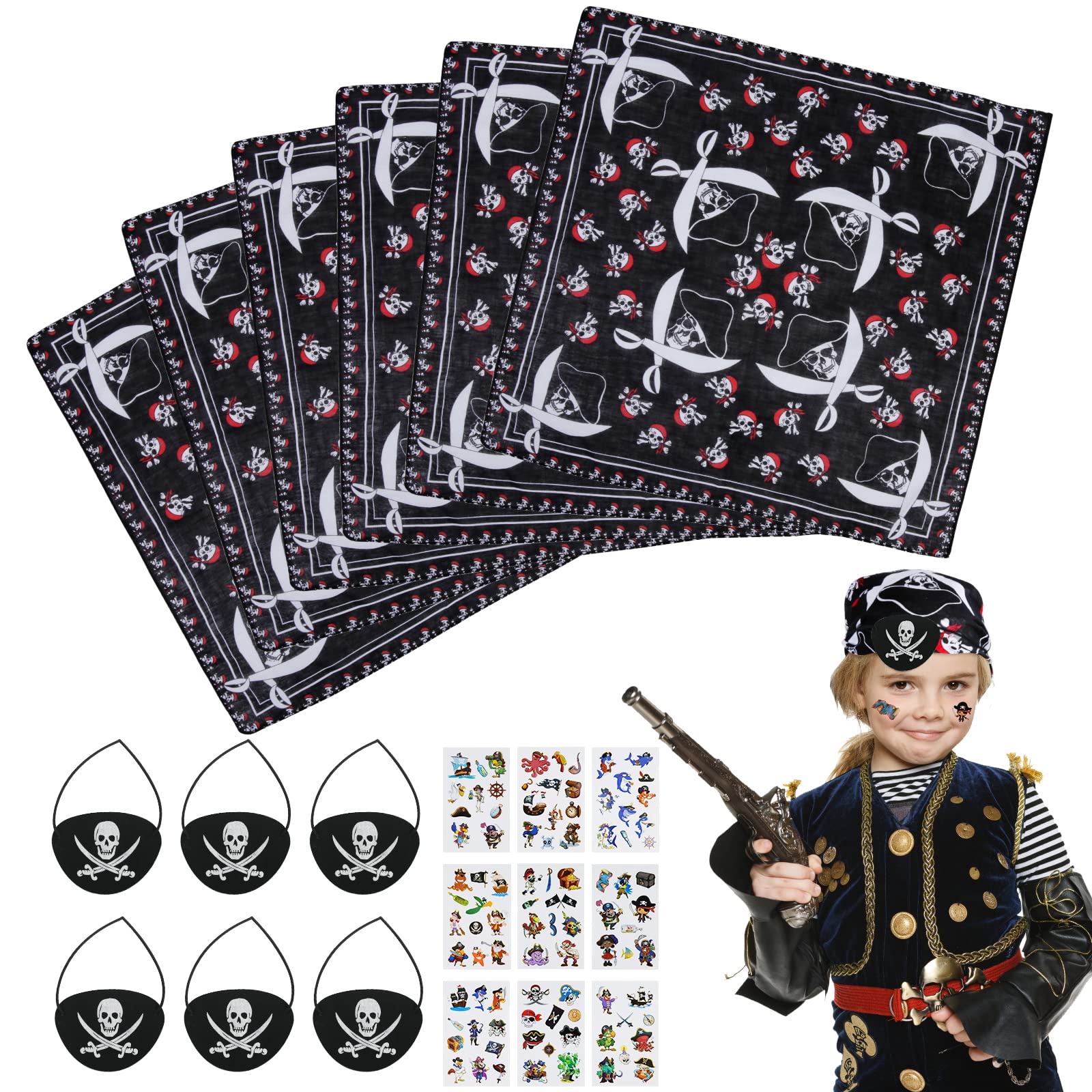 6 Stück Halloween Piraten Kostüm, Piraten Zubehör Inklusive 3 Krawatten- Stirnband Piratenkopf-Bandana 3 Schwarze Piraten Augenklappe In 3 Stilen Für Cosplay-Party