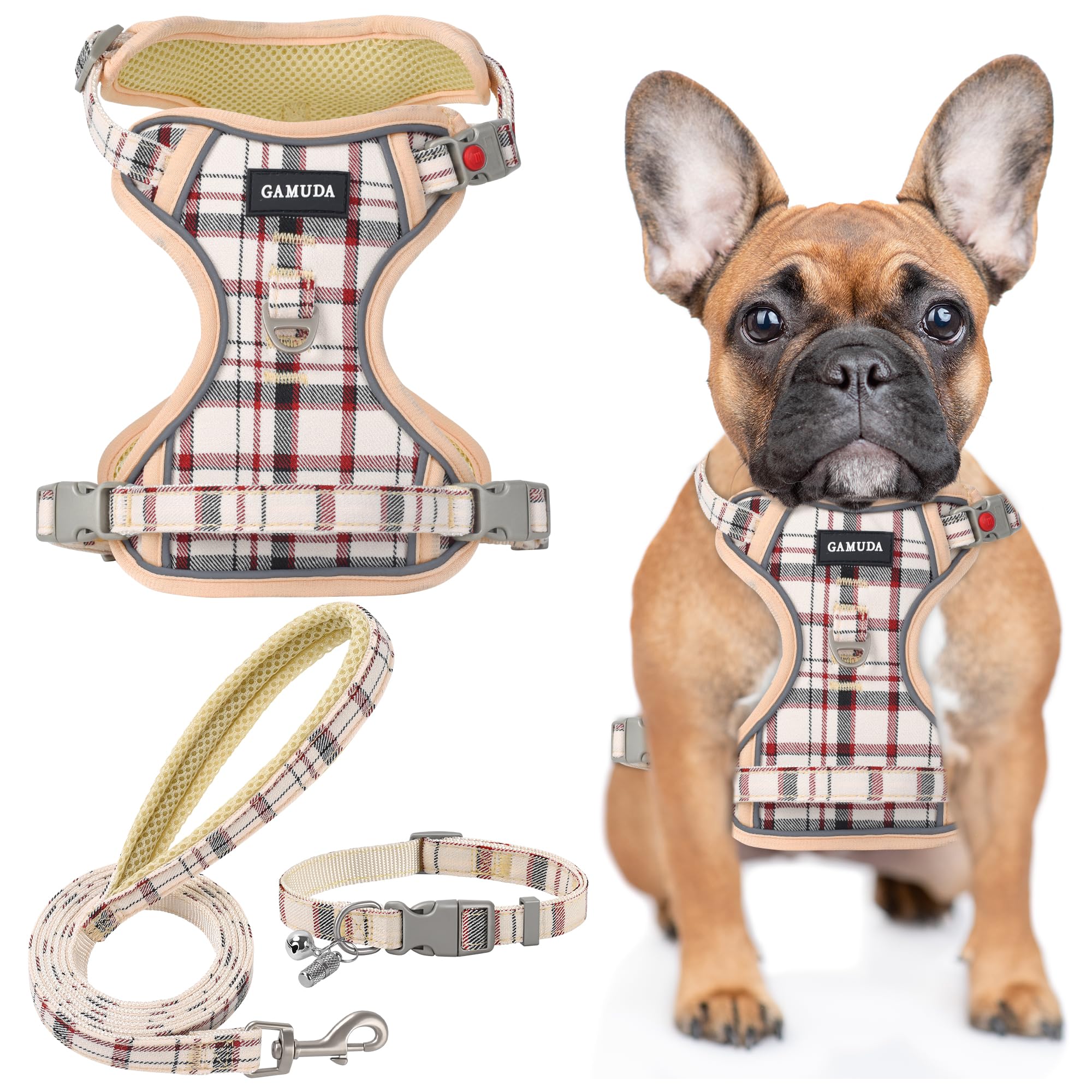 GAMUDA Hundegeschirr Für Kleine Hunde, Halsband Und Leine, Kein Ziehen Weiches Netzgewebe, Verstellbar, Kariert, Reflektierend, Fuer Hunde, Welpen, Katzen, Kaetzchen, Kaninchen, Rot, Groesse Xxs 4640239987