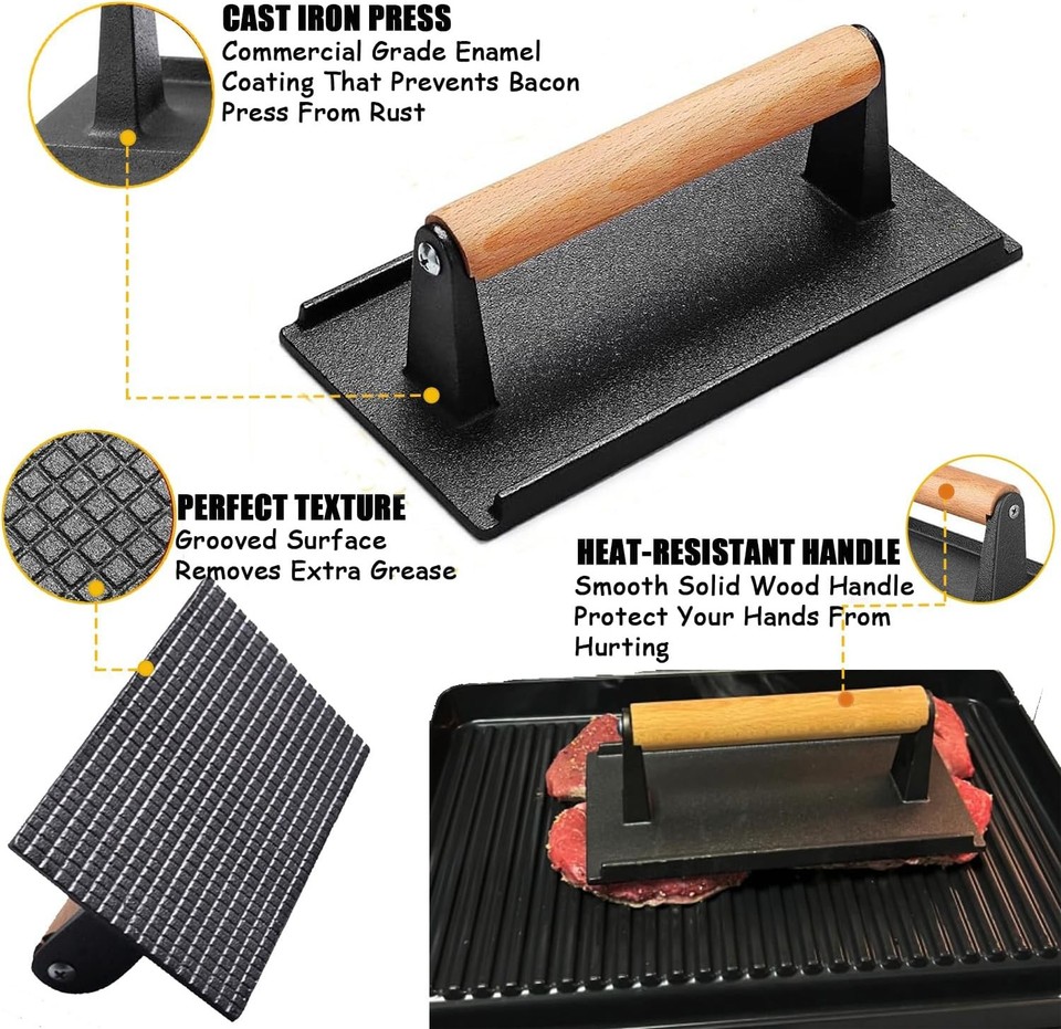 Smash Burger Kit, Heavy Duty Round & Rectangle Cast Iron Smash