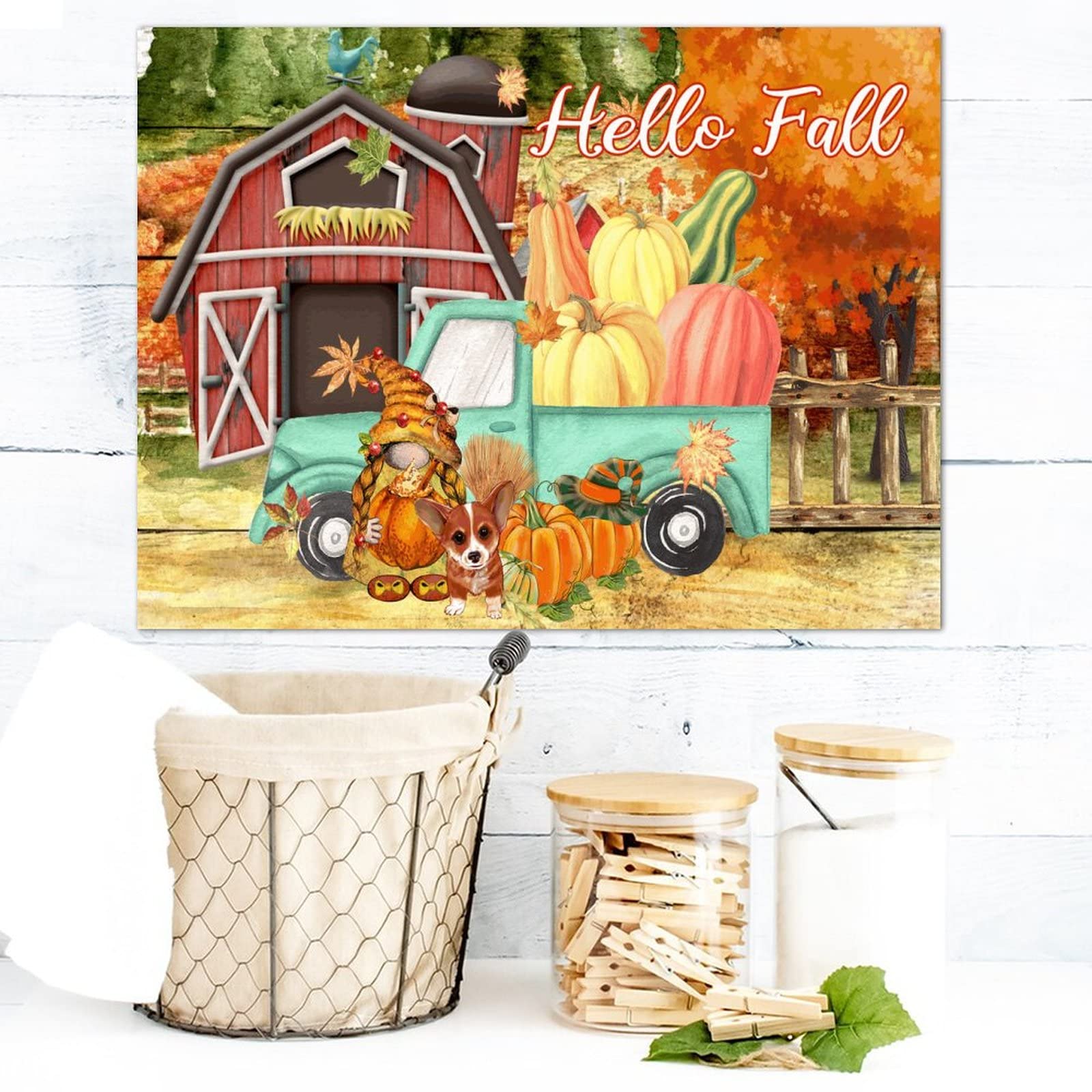 Hello Fall Kürbis Teal Truck Holzschilder Zwerg Scheune Sonnenblume Ahornblätter Holz Plank Hängeschild Bauernhaus Ernte Thanksgiving Zuhause Wandbehang Schild Dekorativ Für Zuhause Schlafzimmer 30 ,5
