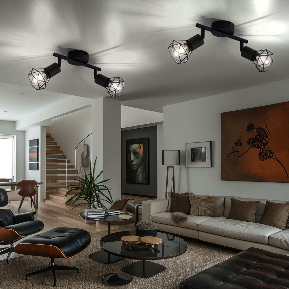 Decken Strahler Leuchte schwarz Wohn Ess Zimmer Retro Käfig Lampe Spot Leiste · Material: Metall · Farbe: schwarz · bewegliche Spots · LxBxH: 60 x 8 x 19,5 cm BESONDERHEIT: Die Strahler überzeugen mit ihrem eleganten Design. etc-shop LED Deckenleuchte, Leuchtmttel nklusve, Warmweß, Vntage... NETTLIFE Deckenstrahler 4 Flammig Vintage Deckenleuchte - Deckenspots Schwarz Metall E27 Spot Deckenlampe Verstellbar 330°Strahler für Wohnzimmer Schlafzimmer Küche Kinderzimmer ohne Leuchtmittel Egal ob modern oder alt diese Leuchte macht überall eine gute Figur. Kombinationen aus Metall und Naturmaterialien, wie Holz, sorgen für einen individuellen Charme. Farbe der Leuchte: schwarz. ABMESSUNGEN: Länge x Breite x Höhe in cm: 60 x 8 x 19,5 , 4-flammige Leuchte EINSATZORT: Durch das Design kann die Lampe in sogut wie jeden Einrichtungsstil integriert werden. Die schwarzen, diamantförmigen Metallkäfige sollten alle Blicke auf sich ziehen. Einsatzort Dieser Deckenstrahler lässt sich in nahezu jeden Wohnraum mit passenden Einrichtungsstil integrieren, z., B., Wohnzimmer, Esszimmer, Schlafzimmer. 40W) selbst auszuwählen und damit Lichtfarbe und Lichtstärke zu bestimmen. Deckenlampe mit beweglichen Spots Der Deckenstrahler überzeugt mit seinem eleganten Design. Mit weiteren Strahlern aus dieser Serie können Sie das Bild in Ihren vier Wänden komplettieren. Dadurch können Sie gezielt im Wohnraum Lichtakzente setzen oder bestimmte Bereich beleuchten. Länge x Breite x Höhe in cm: 60 x 8 x 19,5 Deckenleuchte Schwarz Metall Deckenleuchte, Holz, Spot Verstellbar, L 74 Cm, GEARWOOD Deckenstrahler 3 Flammig Retro Decken Lampen schwarz Flur Strahler Wohn Schlaf Zimmer Leuchten 3-flammig Deckenleuchten Design-Deckenleuchten LED-Deckenleuchten LED-Farbwechsler 284015515560