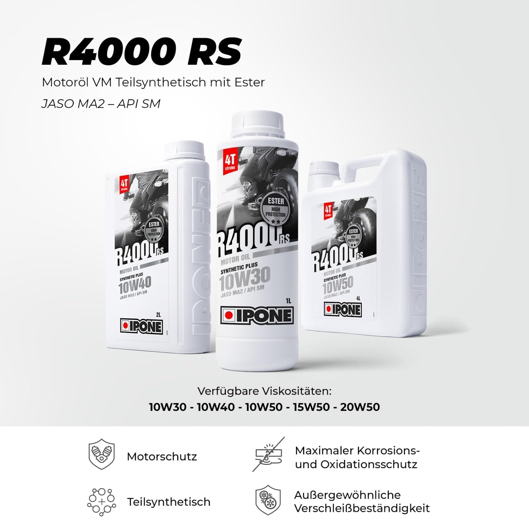 MOTORÖL FÜR VIERTAKT-MOTORRÄDER: Das Motoröl R4000 RS für Viertakt-Motorräder ist ein teilsynthetisches Schmiermittel auf Ester-Basis, das für den regelmäßigen Einsatz entwickelt wurde und einen optimalen Motorenschutz garantiert 4 Takt Motoröl IPONE – Motoröl VT Motorrad 10W40 R4000 RS – 4 Liter Kanister Liqui Moly 10w40 HOCHWERTIGES SCHMIERMITTEL FÜR MOTORRÄDER: Dieses Motoröl für leistungsstarke Viertaktmotoren bietet ausgezeichnete Scherfestigkeit und sorgt für eine ultra-effiziente Schmierung der mechanischen Einzelteile. VERWENDUNG: Das Schmiermittel R4000 RS ist für die regelmäßige Wartung Ihres Viertakt-Motorrads bestimmt und kann zum Auffüllen der Ölwanne des Motors oder für den vollständigen Ölwechsel verwendet werden. IPONE – Motoröl VT Motorrad 10W40 R4000 RS – 1 Liter Kanister – Teilsynthetischer Schmierstoff mit Ester – Hervorragende Qualität – Minimierung von Reibung, Verschleiß und Kraftstoffverbrauch, hervorragende Kaltstarteigenschaften. Verlängerte Ölwechselintervalle gemäß Herstellervorschrift IPONE 100% MOTORRAD: Bereits seit 1985 spezialisiert sich IPONE auf erstklassige Motorradschmierstoffe sowie Pflege- und Wartungsprodukte, die auch die anspruchsvollsten Motorrad-Enthusiasten rundum zufrieden stellen. IPONE - Motoröl 4-Takt-Motorrad 10W30 Full Power Katana - 4 L-Kanister
