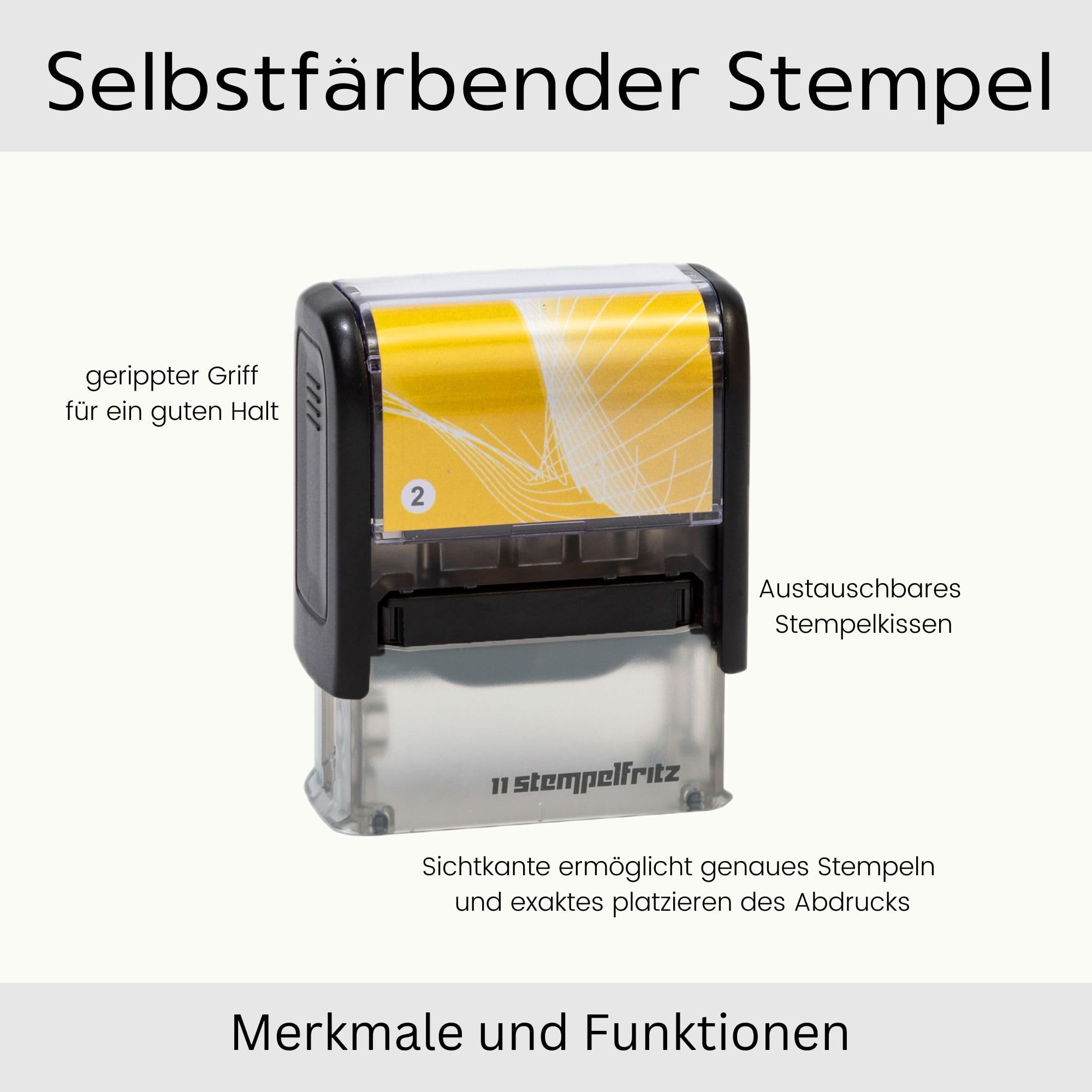 Selbstfärbenr Stempel stempelfritz Gr.2 direkt hier Erstellen - personalisierter Firmenstempel, Adressstempel, Namensstempel or Familienstempel - Gehäuse Schwarz-Gelb, 47x18mm, max. 5 Zeilen Stempel Selbstfärbend Personalisiert Stempel - Imprint 12 By Trodat - Firmenstempel Adresstempel Selbstfärbender Textstempel Stempelkissen Schwarz GLEICH HIER BESTELLEN: Geben sie über Jetzt anpassen, rechts oben ihren individuellen Wunschtext ein – es stehen Ihnen verschiedene Schriftarten sowie 3 Rahmen zur Verfügung – Lieferung erfolgt umgehend 5 ZEILEN TEXT: Gestalten Sie ihren Abdruck selbst mit bis zu 5 Zeilen, es stehen Ihnen hierzu 4 Abdruck-Farben zur Auswahl Dieser individuelle Stempel ist auch eine tolle und ganz persönliche Geschenkidee - zum Beispiel zur Hochzeit, zur Geburt oder zum Umzug. GLEICH HIER BESTELLEN: Geben sie über Jetzt anpassen, rechts oben ihren individuellen Wunschtext ein – es stehen Ihnen verschiedene Schriftarten sowie 3 Rahmen zur Verfügung – Lieferung erfolgt umgehend ERSATZKISSEN: Stempelkissen Trodat 6/4912 wird mitgeliefert und kann jederzeit nachbestellt werden – gleichbleibend kräftige, konturenscharfe und schnell trocknende Abdrucke, wischfest auf Papier, Pappe, Briefe, Helfe und in Büchern Personalisierter Stempel easyprint 2 - Selbstfärbend mit Individuellem