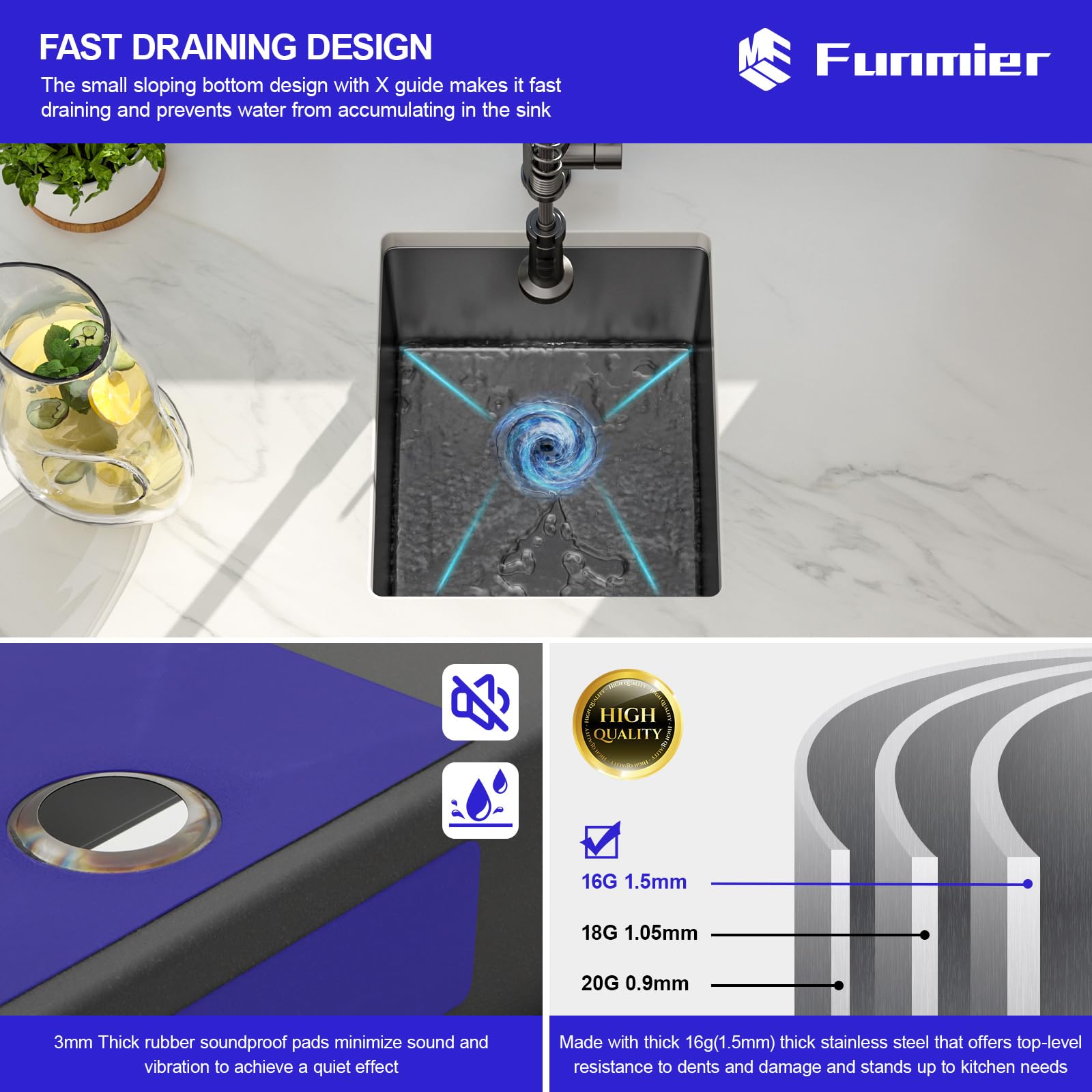 【Einfache Installation】Entwickelt für nahtlose Integration, bietet die 38,1 x 43,2 cm Unterbauspüle reichlich Platz auf der Theke. 【Überlegene Qualität】 Die Funmier Gunmetal Black Unterbau-Barspüle ist aus hochwertigem Edelstahl T304 mit einer mattschwarzen NANO gebürsteten Oberfläche gefertigt. Bei günstige Preise für Unterbauspüle Edelstahl vergleichen Funmier reinforced packaging ensures safe delivery, while the limited lifetime warranty guarantees peace of mind. Verschönern Sie Ihre Küche mit diesem vielseitigen, tiefen Tafelaufsatz, wo robuste Haltbarkeit auf mühelosen Stil trifft. Eine 8,9 cm große Ablauföffnung unterstützt Müllentsorgungen, Sie benötigen nur eine Flanschabdeckung (nicht im Lieferumfang enthalten), um mit den Müllentsorgungen zu verbinden. Diese Unterbau-Barspüle schafft eine nahtlose, platzsparende Optik, während die leicht abgeschrägten Seiten eine schnelle Entwässerung fördern und Wasseransammlungen eliminieren. Die X-förmige Wasserführung und die R10-Radius-Ecken sorgen für mühelose Reinigung und Haltbarkeit, mit einer robusten Dicke von 1,35 mm. Hydda Spüle Stahl 54x44 cm 1 Becken schwarz 71104300 Bei Fragen zu dieser schwarzen Barspüle kontaktieren Sie uns bitte und wir werden uns so schnell wie möglich bei Ihnen melden. Zubehör: Das Paket enthält die Unterstangenspüle, das Sieb, das aufrollbare Gestell, das untere Spülgitter, die Ausschnittschablone, eine Montageanleitung (evtl. Unterbauspüle Edelstahl Guangdong Made In China Anti-kratzer Nano Schwarz Küche Edelstahl Einzelbecken S Unterbauspüle Herren Im Lieferumfang enthalten sind eine Edelstahl-Siebmontage und ein unteres Gitter, um das Waschbecken vor Kratzern zu schützen und das Stapeln von Geschirr zu vereinfachen. Kitchen Island • Outdoor Spüle • Edelstahl anthrazit • RÖSHULTS Diese 38,1 x 43,2 cm große Barspüle ist aus Edelstahl mit einer gebürsteten T304-Oberfläche, um Kratzer und Flecken zu verhindern.