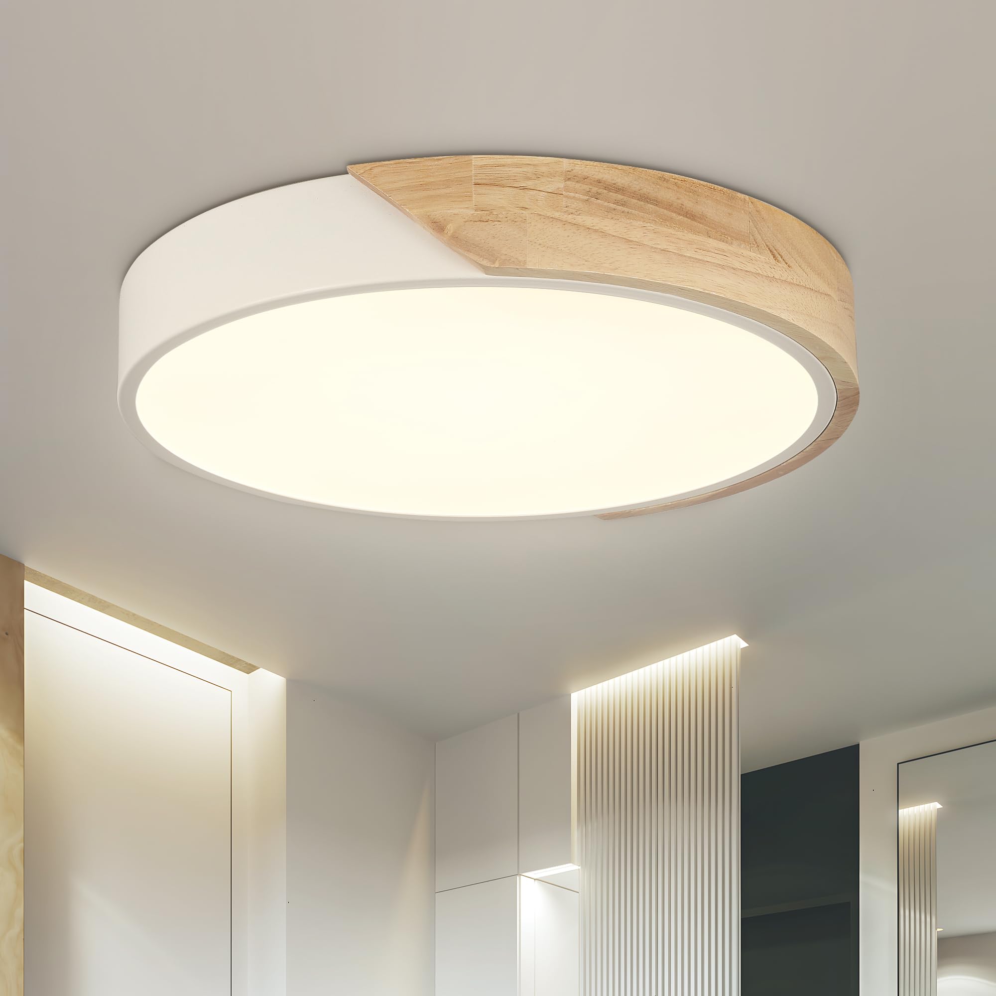 JINWELL Holz Deckenleuchte Weiß Runde Schlafzimmer Lampe Wohnzimmer