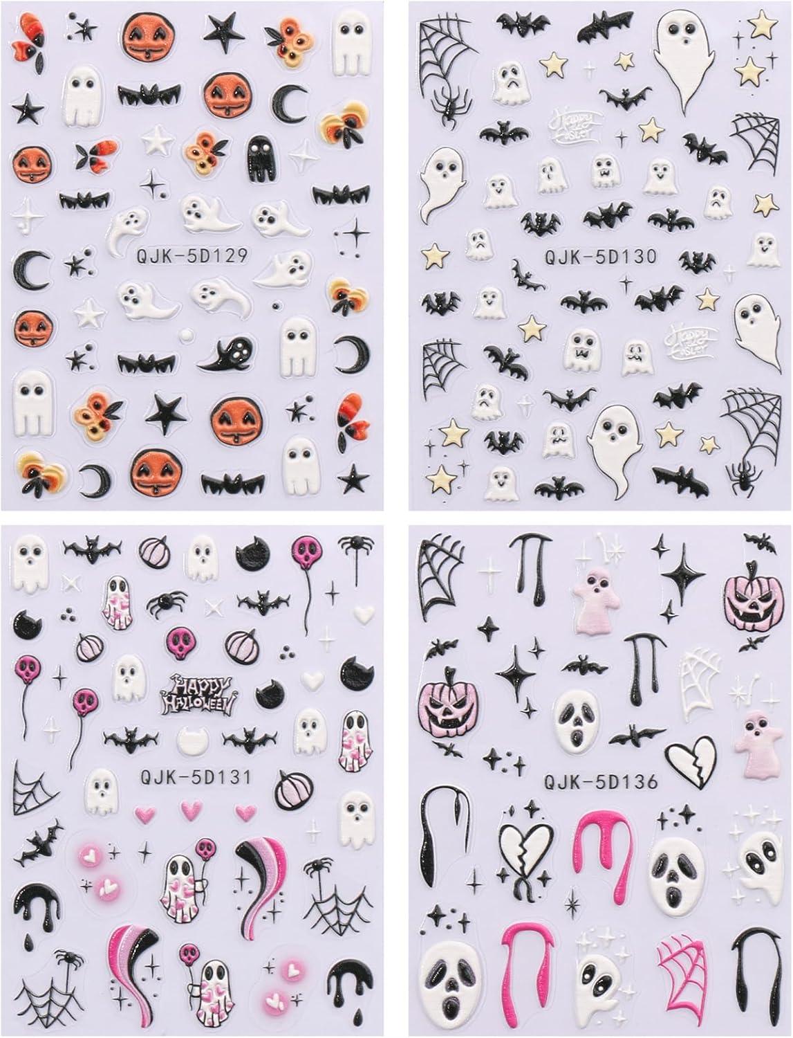 JMEOWIO 3D Nagelsticker Halloween Nail Art Sticker Selbstklebend Nagelaufkleber 5D Stereoskopisch Schädel Geist Hexe Spinnennetz Fledermaus-Kürbis-Spook Dekoration Nageldesign Zubehör 4 Blatt