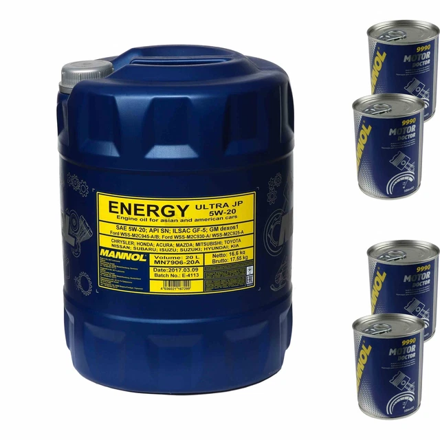 1Liter MANNOL Energy Ultra JP 5W-20 API SN 350ml Original MANNOL 9990 Motor Doctor Lieferumfang2x 1Liter MANNOL Energy Ultra JP 5W-20 API SN1x 350ml Original MANNOL 9990 Motor DoctorDetails1L MANNOL Energy Ultra JP 5W-20 API SNMenge: 1 LViskositätsklasse SAE: 5W20Beschreibung: Modernes Leichtlauf-Motorenöl der Premiumklasse, das speziell für die ganzjährige Schmierung von Viertaktmotoren japanischer, koreanischer und amerikanischer Pkw, Minivans und SUVs entwickelt wurde. Optimal für moderne Motoren mit direktem Einspritzsystem, Turbolader und variabler Ventilsteuerung (VTEC, VVT-i, VTC, CVVT, VVL, VVTL-i, MIVEC usw., ). Dieser Schmierstofffilm stellt eine einwandfreie Funktionsweise des Motors unter schwierigen Einsatzbedingungen sicher und garantiert einen problemlosen Kaltstart. Freigaben: API SN ILSAC GF-5 GM dexos1 FORD WSS-M2C945-A/B FORD WSS-M2C930-A FORD WSS-M2C925-A CHRYSLER HONDA/ACURA MAZDA MITSUBISHI TOYOTA NISSAN SUBARU ISUZU SUZUKI HYUNDAI KIA MOTORSHersteller: MANNOL350ml MANNOL Motor DoctorMenge: 350mlBeschreibung: MANNOL Motor Doctor ist ein Additiv, das zur Erhöhung des Öldrucks und zur Verbrauchsreduzierung von Öl in verschlissenen Motoren dient. MANNOL Energy Ultra JP SAE 5W-20 ist ein innovatives, energiesparendes, bisynthetisches Premium-Motoröl (PAO + Ester) für moderne Benzin- und Dieselmotoren. Entwickelt entsprechend der Anforderungen amerikanischer, japanischer und koreanischer Autobauer Mannol Energy Ultra Jp 2L Motoröl 5W-20 1x MANNOL Motor Doctor ADDITIV Mannol 5w 20 Jp Die Kombination ausgesuchter Grundöle in Verbindung mit neuesten Additiven garantieren ein Motoröl, das hervorragend vor Verschleiß schützt, den Motor sauber hält und für eine dauerhafte Schmierung des Motors sorgt. MANNOL Motoröl 5W30 Energy Formula JP API SN 4 Liter online im MV, 18,49