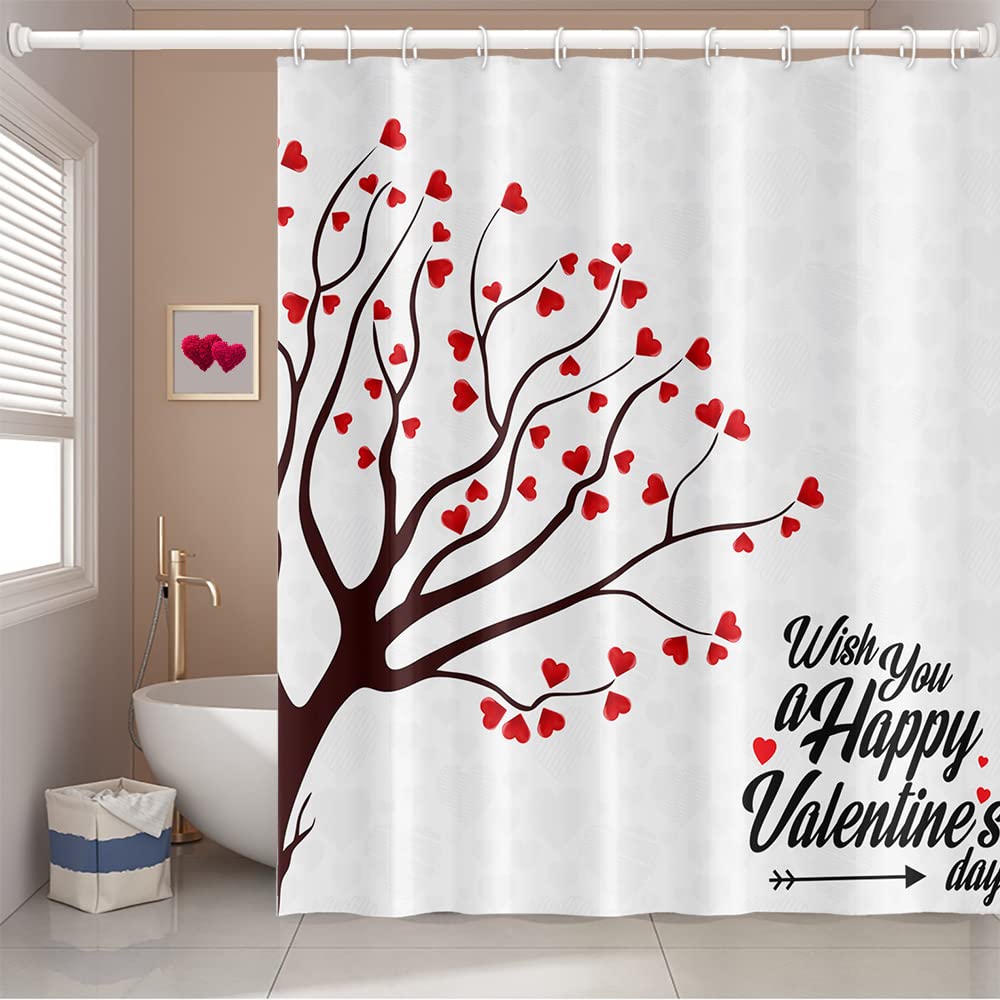 JUZGTSIT Duschvorhang Mit Aufschrift "Happy Valentine's Day", 152,4 X 183,9 Cm, Rote Liebe, Herz, Baum, LKW, Lustige Zwerge, Luftballons Für Badezimmer, Dekoration, Stoff-Duschvorhang-Sets Mit Haken